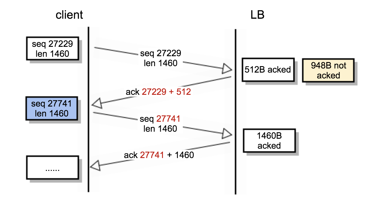 - 第六阶段:在27KB之后,LB连续发送数十个DupAck,然后客户端发送一次TCP fast retransmission;这样的情况持续到客户端把所有应该发的数据包都发完。