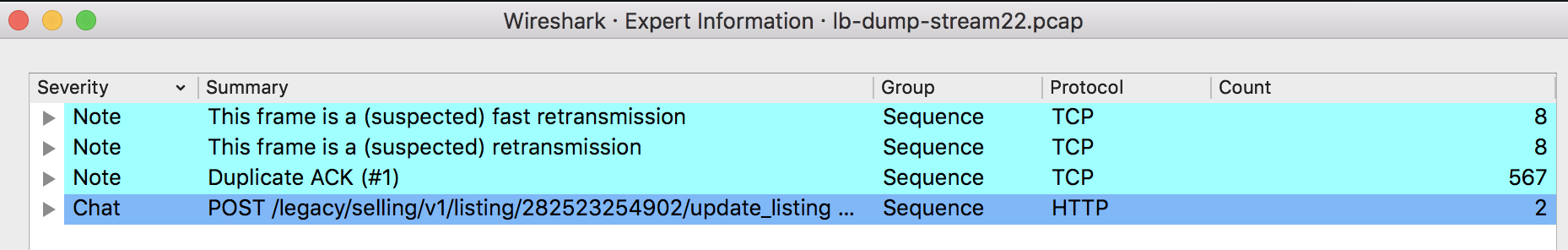 那么,我们可以在Wireshark里打开Expert Information看一下汇总信息。