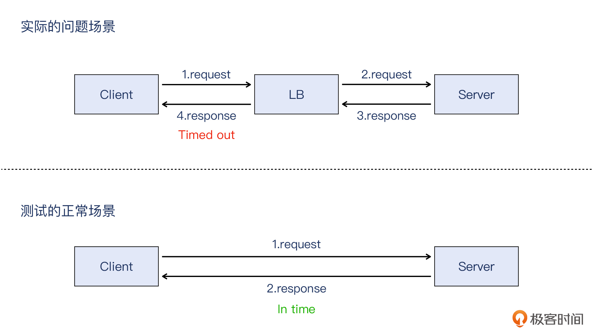 - **对于“超时、处理慢”这类问题,建议你对比客户端和服务端的耗时,这有利于你找到正确的排查方向。**在这个案例中,我们比较了两端的耗时,发现两者接近;然后,通过在服务器上做系统排查,发现时间主要花费在read()上,这就说明,问题很可能出在网络或者LB上。课程中我给你整理了一段伪代码,梳理了这种排查思路,你可以拿来参考。