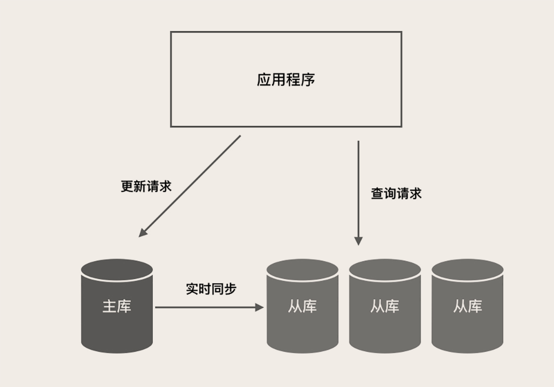 主库负责执行应用程序发来的所有数据更新请求,然后异步将数据变更实时同步到所有的从库中去,这样,主库和所有从库中的数据是完全一样的。多个从库共同分担应用的查询请求。