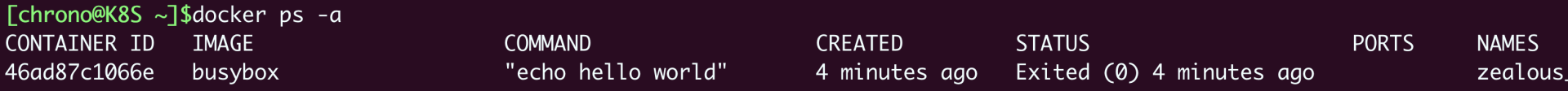 然后我们再用 docker ps 命令,加上一个参数 -a ,就可以看到这个已经运行完毕的容器:
