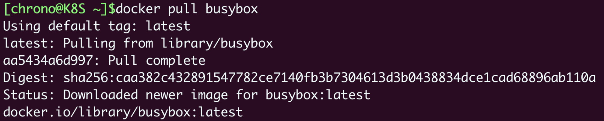 接下来,让我们尝试另一个非常重要的命令 docker pull ,从外部的镜像仓库(Registry)拉取一个busybox镜像(image),你可以把它类比成是Ubuntu里的“apt install”下载软件包: