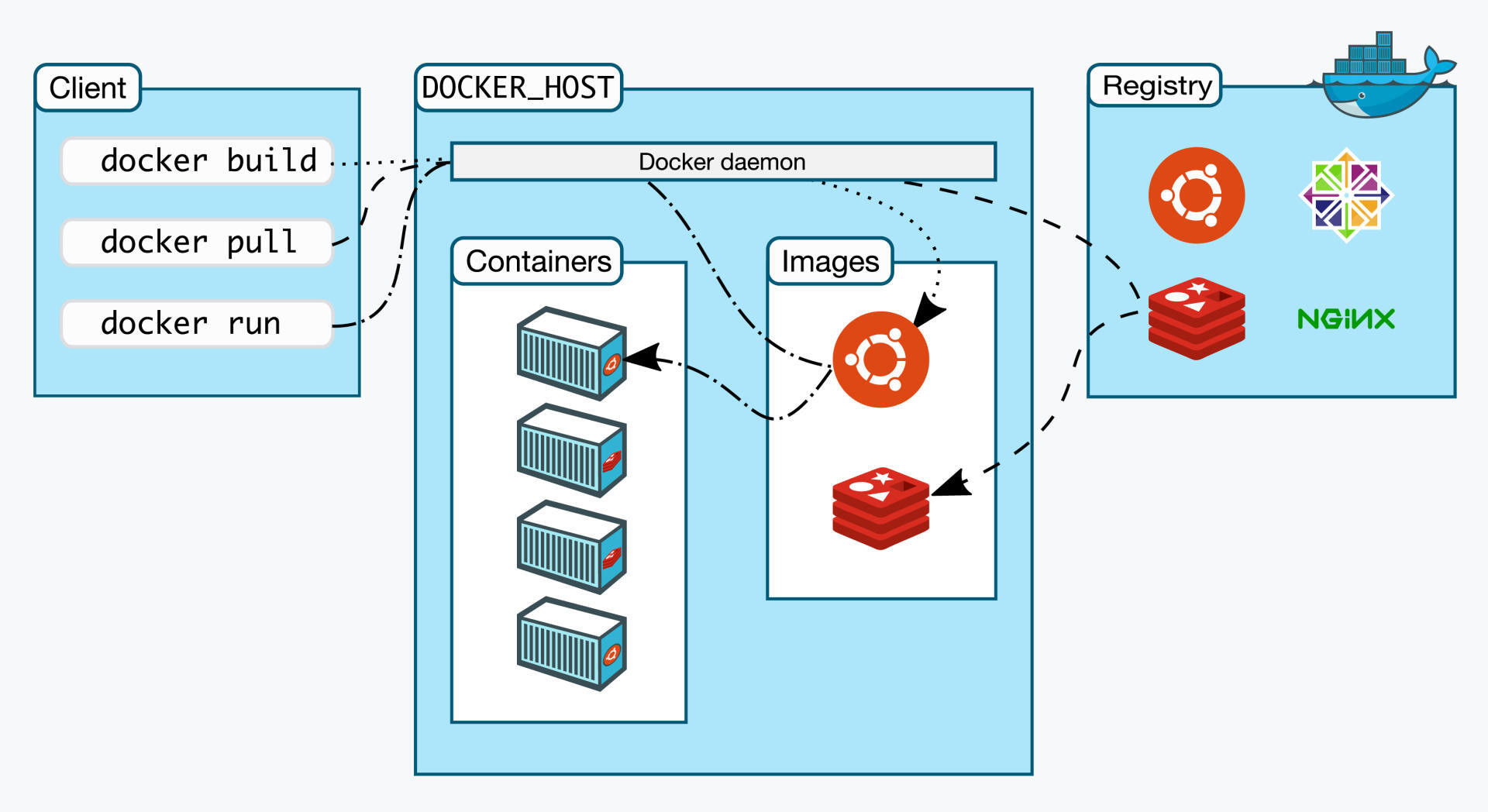 Docker client可以通过 build、pull、run等命令向Docker daemon发送请求,而Docker daemon则是容器和镜像的“大管家”,负责从远端拉取镜像、在本地存储镜像,还有从镜像生成容器、管理容器等所有功能。