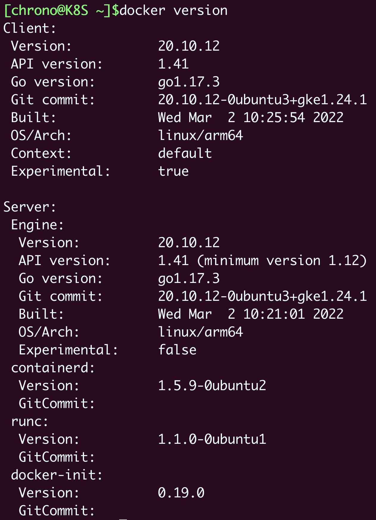 下面是我从中摘出的比较关键的版本号和系统信息。可以看到,我使用的是Docker Engine 20.10.12,系统是Linux,硬件架构是arm64,也就是Apple M1: