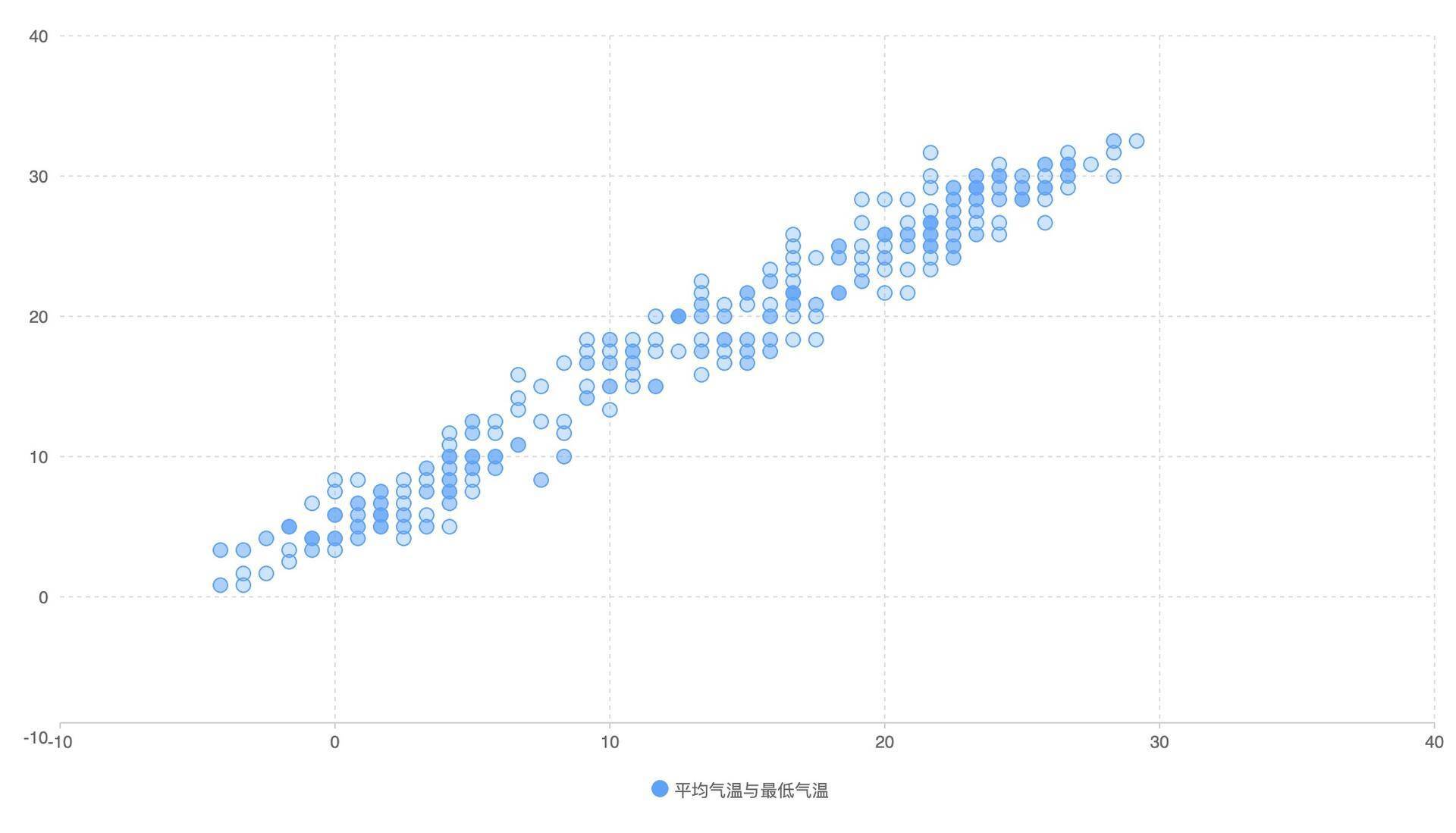 从定义里我们知道,露点和温度与湿度都有相关性。接下来,我们来看一下露点和温度的相关性在散点图中是怎么体现的。很简单,我们只要修改一下上面代码里的数据,把平均湿度换成平均露点温度就行了。