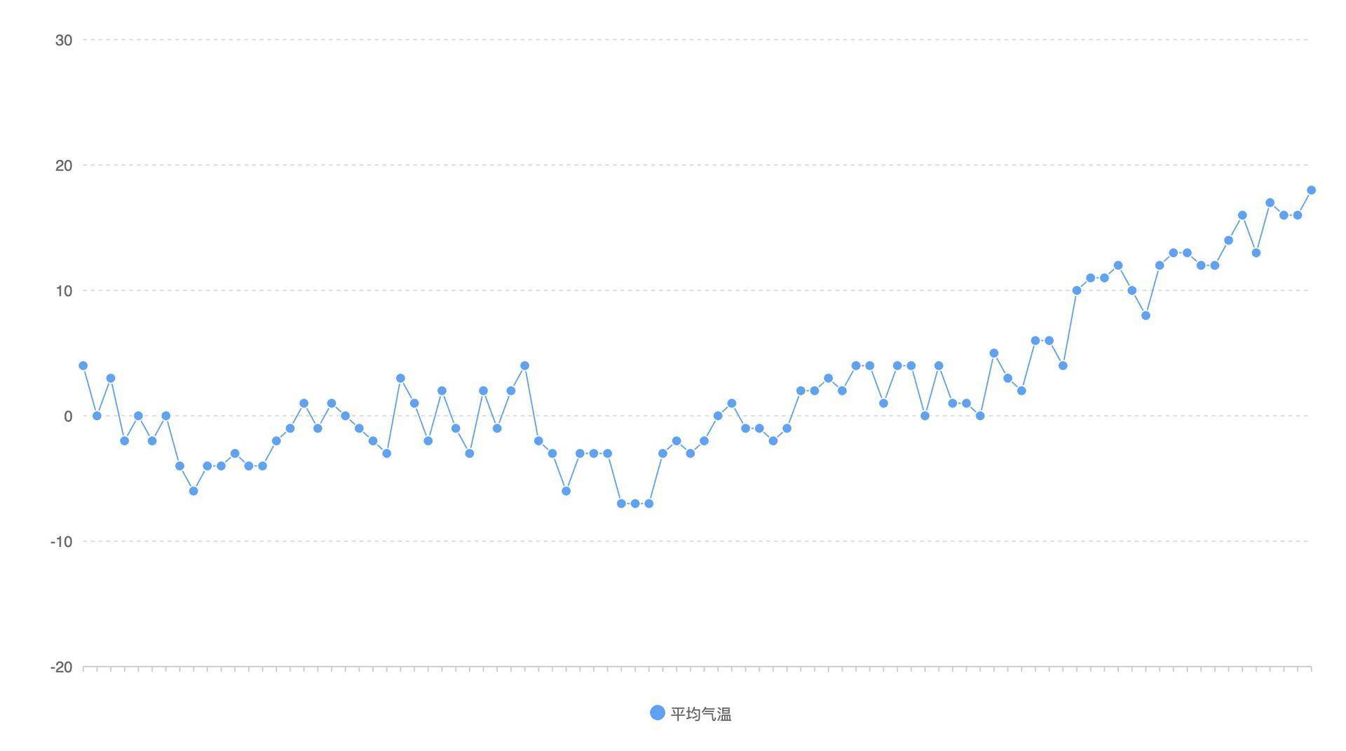 如上面代码所示,我们通过fetch读取csv的数据。CSV文件格式是用逗号和回车分隔的文本,所以我们用.text()读取内容。然后我们使用d3的csvParse方法,将数据解析成JSON数组。最后,我们再通过数组的filter和map,将我们感兴趣的数据取出来。这里,我们截取了1月到3月的平均气温数据。