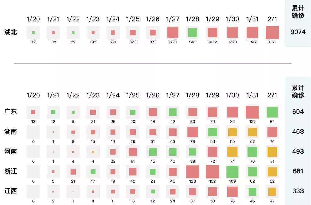 事实上,处理多维信息,我们还可以用其他的图表展现形式,比如用晴雨表来表示数据变化的趋势就比较合适。北大可视化实验室在疫情期间就制作了一张疫情数据晴雨表,你能明显看出每个省份每天的疫情变化。如下所示: