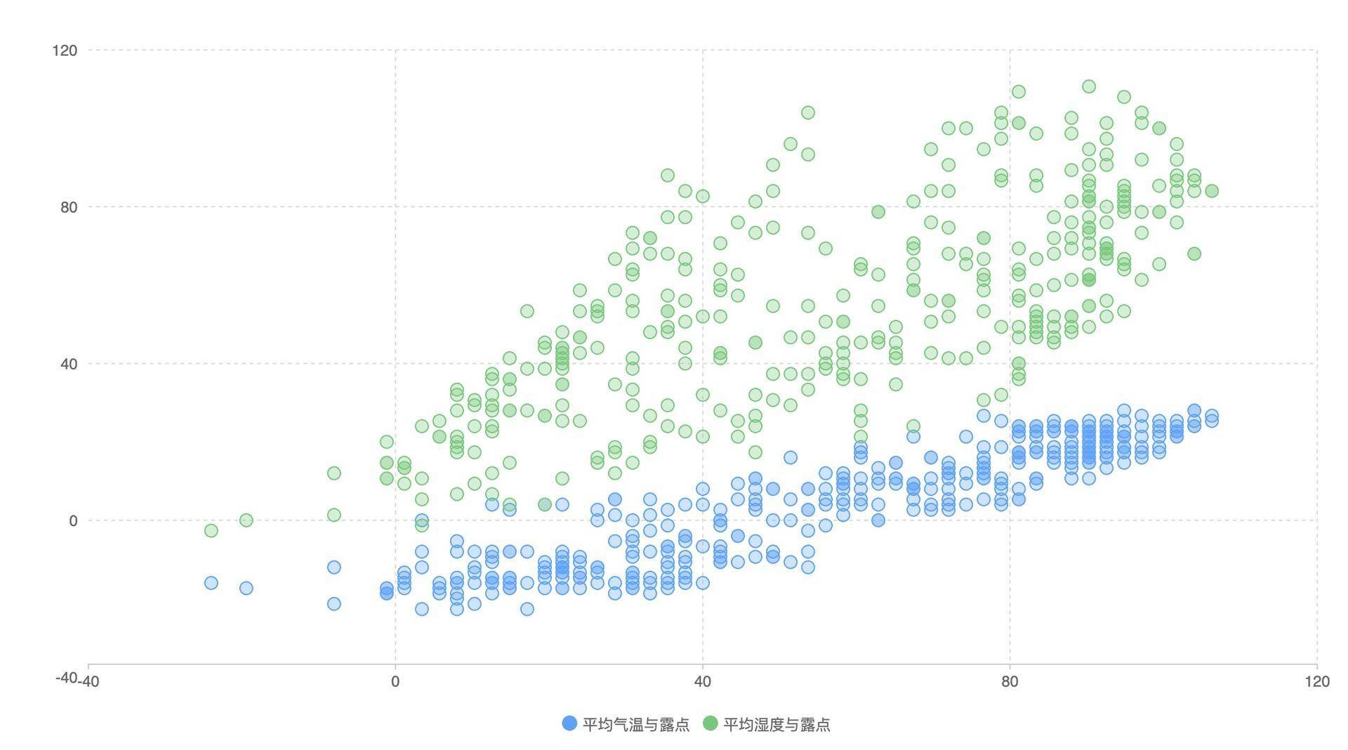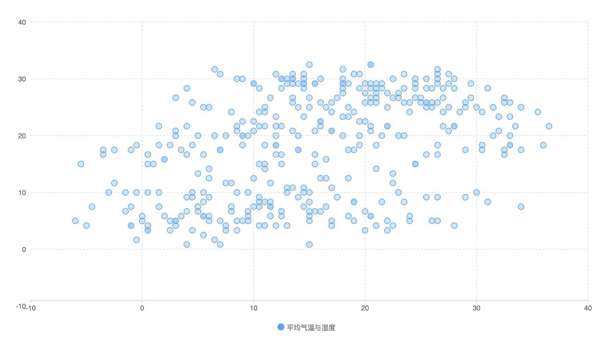 一般来说,要分析两个变量的相关性,我们可以使用散点图,散点图有两个坐标轴,其中一个坐标轴表示变量A,另一个坐标轴表示变量B。这里,我们将平均温度、相对湿度数据获取出来,然后用QCharts的散点图(Scatter)来渲染。具体的代码和示意图如下: