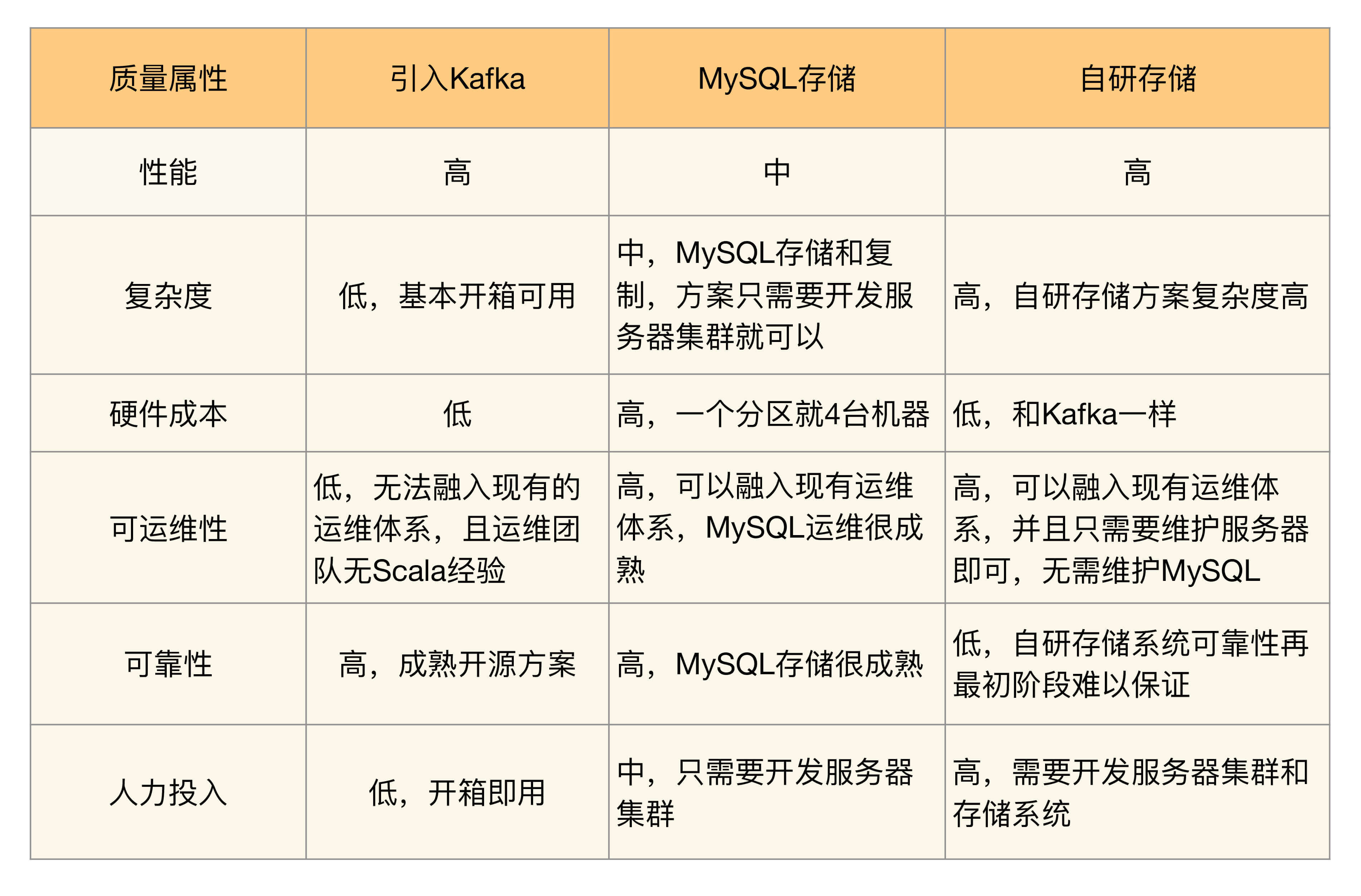 - 中间件团队的研发人员认为这个方案比较简单,但部分研发人员对于这个方案的性能持怀疑态度,毕竟使用MySQL来存储消息数据,性能肯定不如使用文件系统;并且有的研发人员担心做这样的方案是否会影响中间件团队的技术声誉,毕竟用MySQL来做消息队列,看起来比较“土”、比较另类。