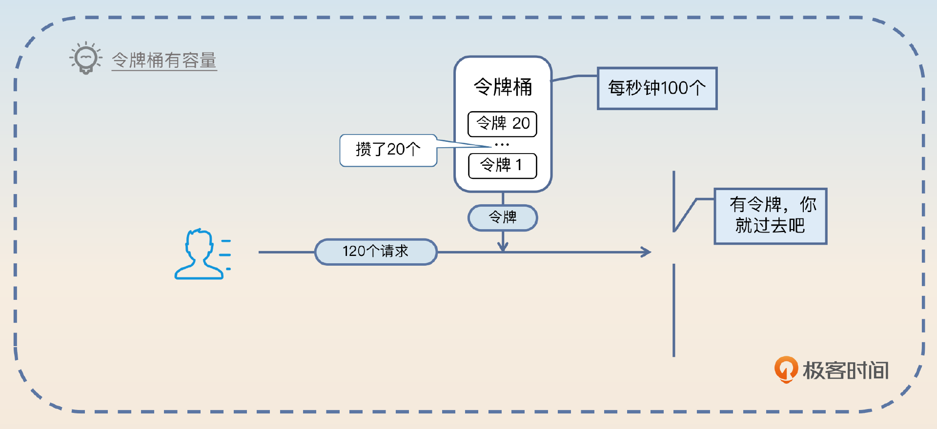 你需要注意**,本身令牌桶是可以积攒一定数量的令牌的**。比如说桶的容量是 100,也就是这里面最多积攒 100 个令牌。那么当某一时刻突然来了 100 个请求,它们都能拿到令牌。