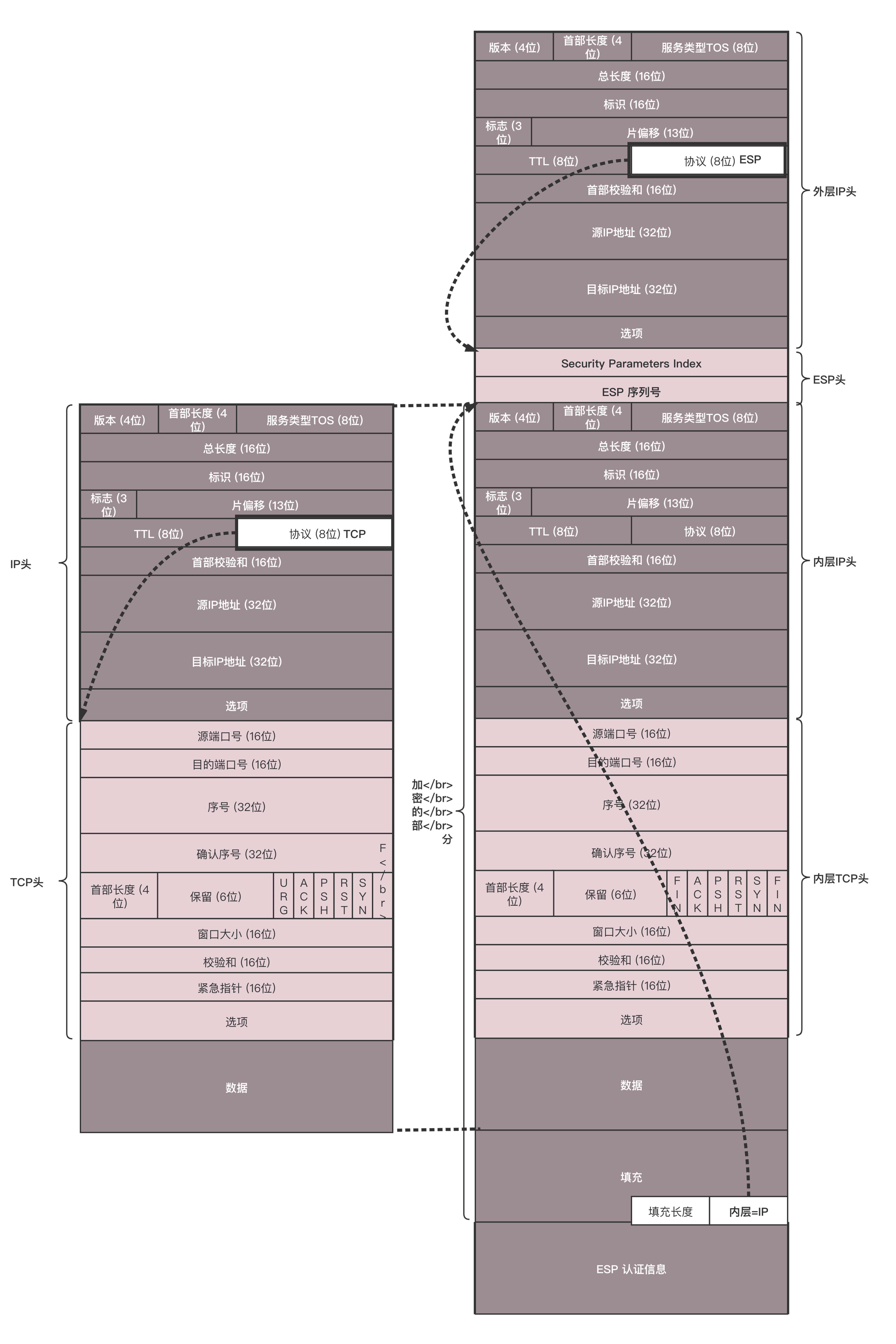 左面是原始的IP包,在IP头里面,会指定上一层的协议为TCP。ESP要对IP包进行封装,因而IP头里面的上一层协议为ESP。在ESP的正文里面,ESP的头部有双方商讨好的SPI,以及这次传输的序列号。