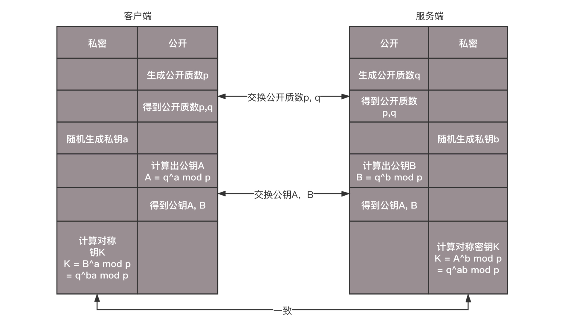 DH算法是一个比较巧妙的算法。客户端和服务端约定两个公开的质数p和q,然后客户端随机产生一个数a作为自己的私钥,服务端随机产生一个b作为自己的私钥,客户端可以根据p、q和a计算出公钥A,服务端根据p、q和b计算出公钥B,然后双方交换公钥A和B。
