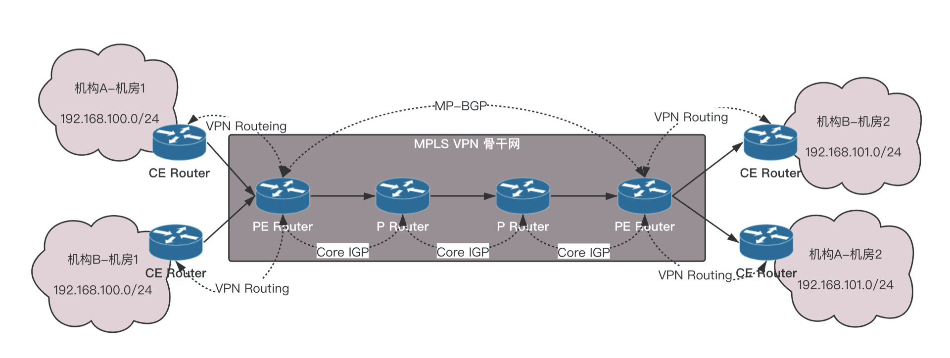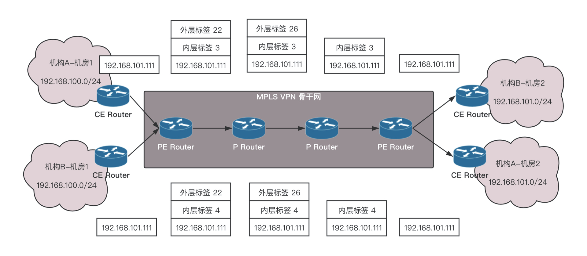 - 机构A和机构B都发出一个目的地址为192.168.101.0/24的IP报文,分别由各自的CE将报文发送至PE。