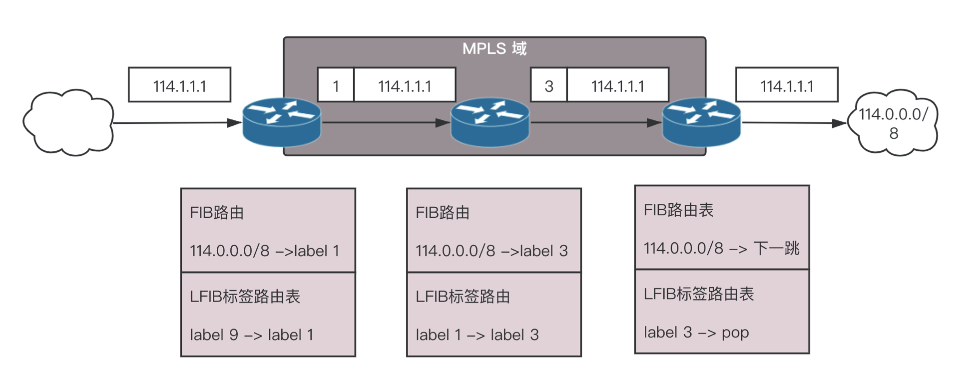 例如图中要访问114.1.1.1,在边界上查找普通路由,发现马上要进入MPLS区域了,进去了对应标签1,于是在IP头外面加一个标签1,在区域里面,标签1要变成标签3,标签3到达出口边缘,将标签去掉,按照路由发出。