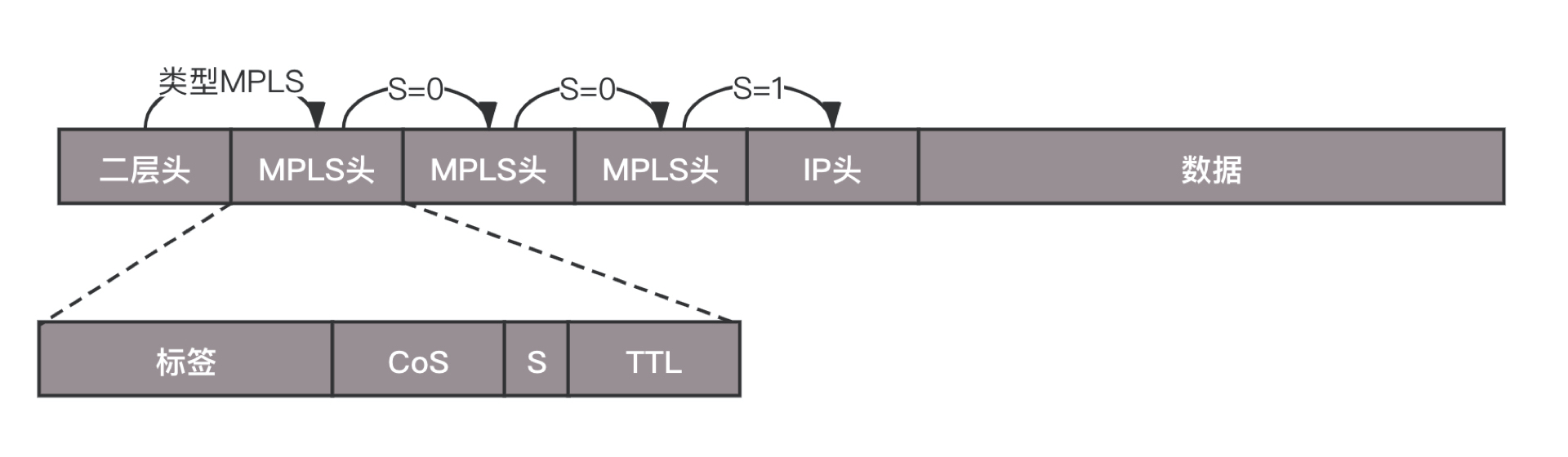 在二层头里面,有类型字段,0x0800表示IP,0x8847表示MPLS Label。