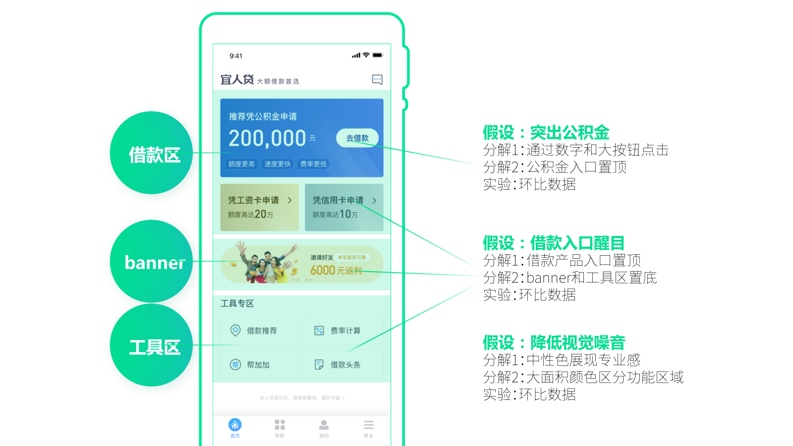 因为指标是“借款转化率提升,公积金点击提升”,而其中公积金转化提升更加重要。所以,对应的假设就很容易得出了,分别是“借款入口醒目”“突出公积金”“降低视觉噪音”。