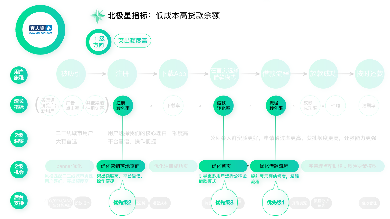 首先是指标,从用户增长地图上我们可以看到“优化首页”对应的指标是借款转化率,也就是说这个指标是一个基础的必须要考虑的指标。另外首页有一个很重要的作用,就是流量分发,把正确的用户引导到正确的地方去。