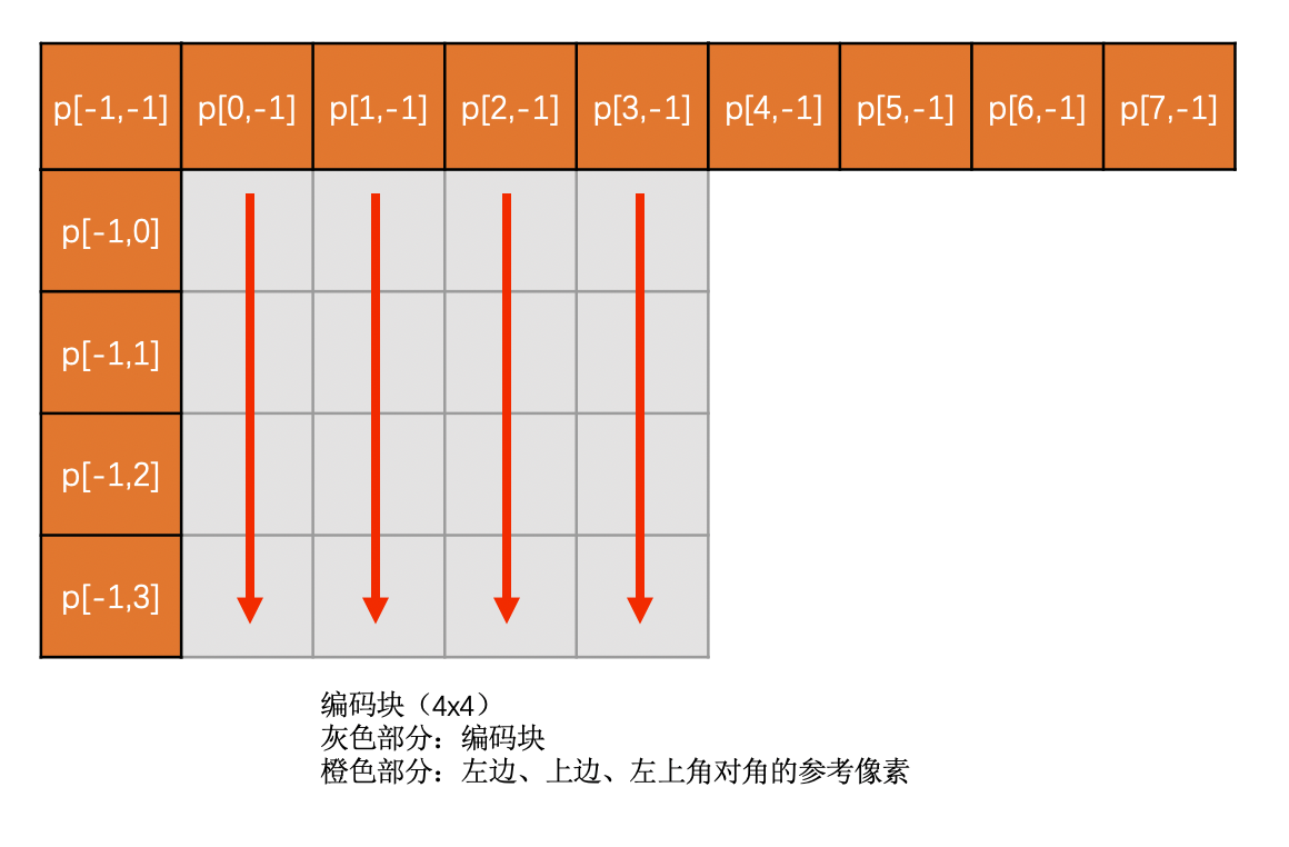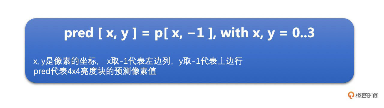 **Vertical模式就是指,当前编码亮度块的每一列的像素值,都是复制上边已经编码块的最下面那一行的对应位置的像素值。**这句有点拗口,别急,等会儿我会给出计算方法和示意图,让你能很容易地理解它。