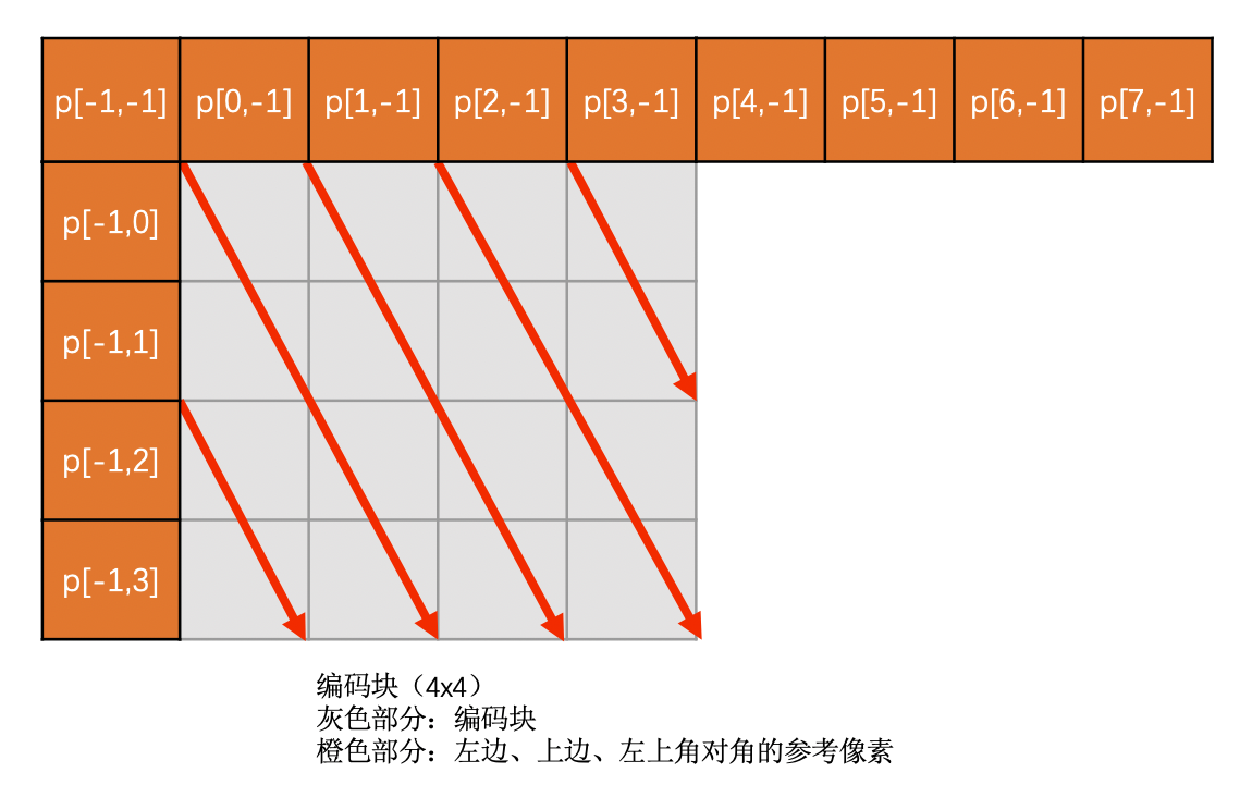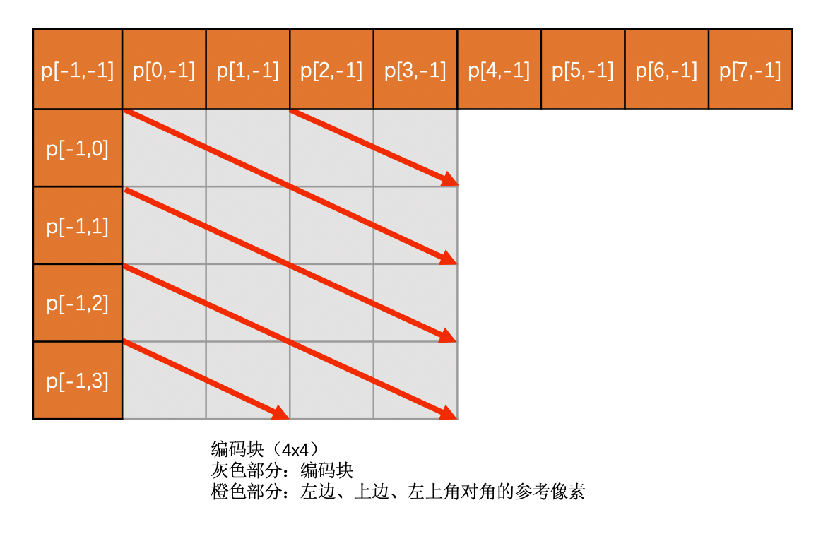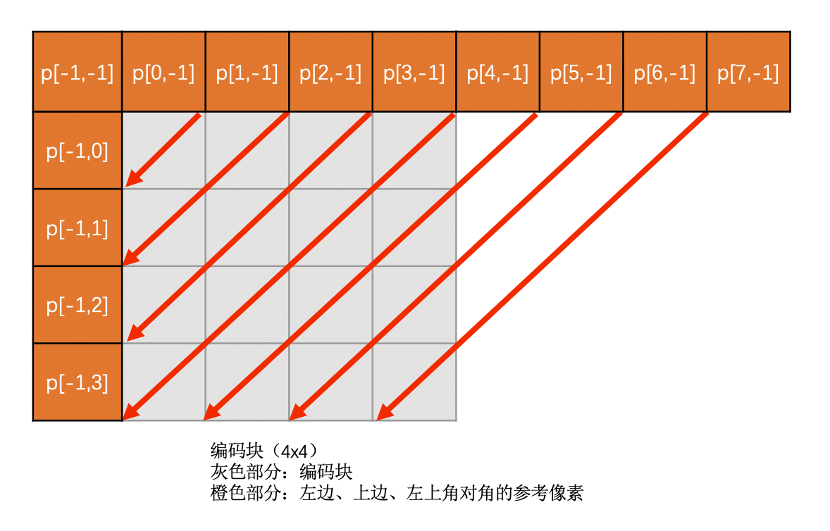 Vertical-Right模式是需要通过上边块、左边块以及左上角对角的像素插值得到的。必须要这三个都有效才能使用,否则该模式无效。