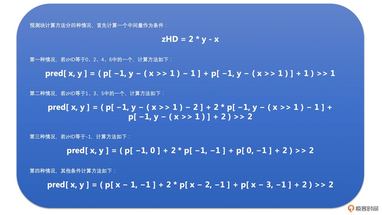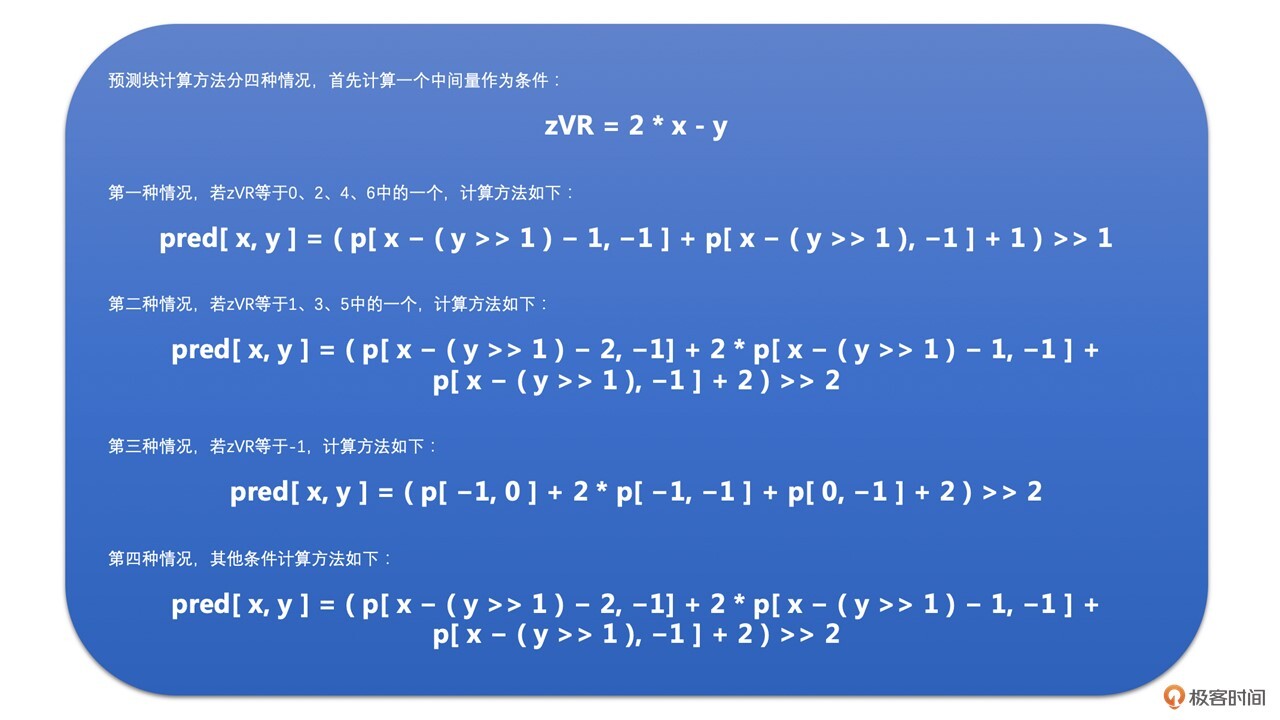 根据上边块和左边块是不是存在,该模式下预测块像素的计算方法分为以下四种情况: