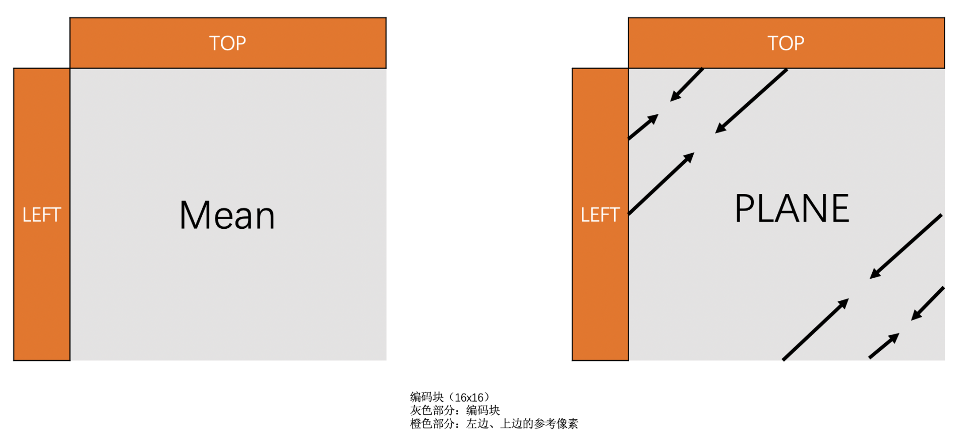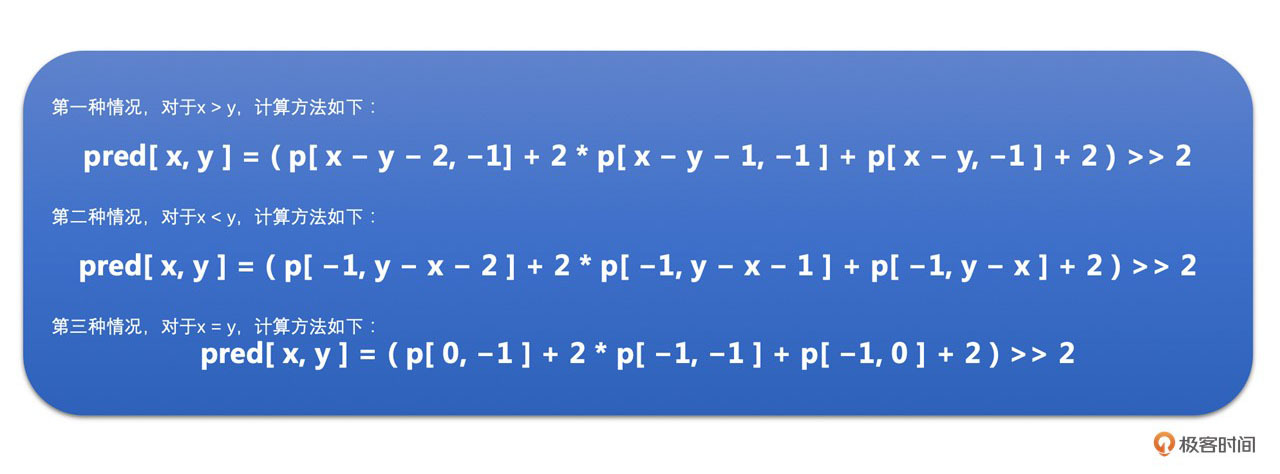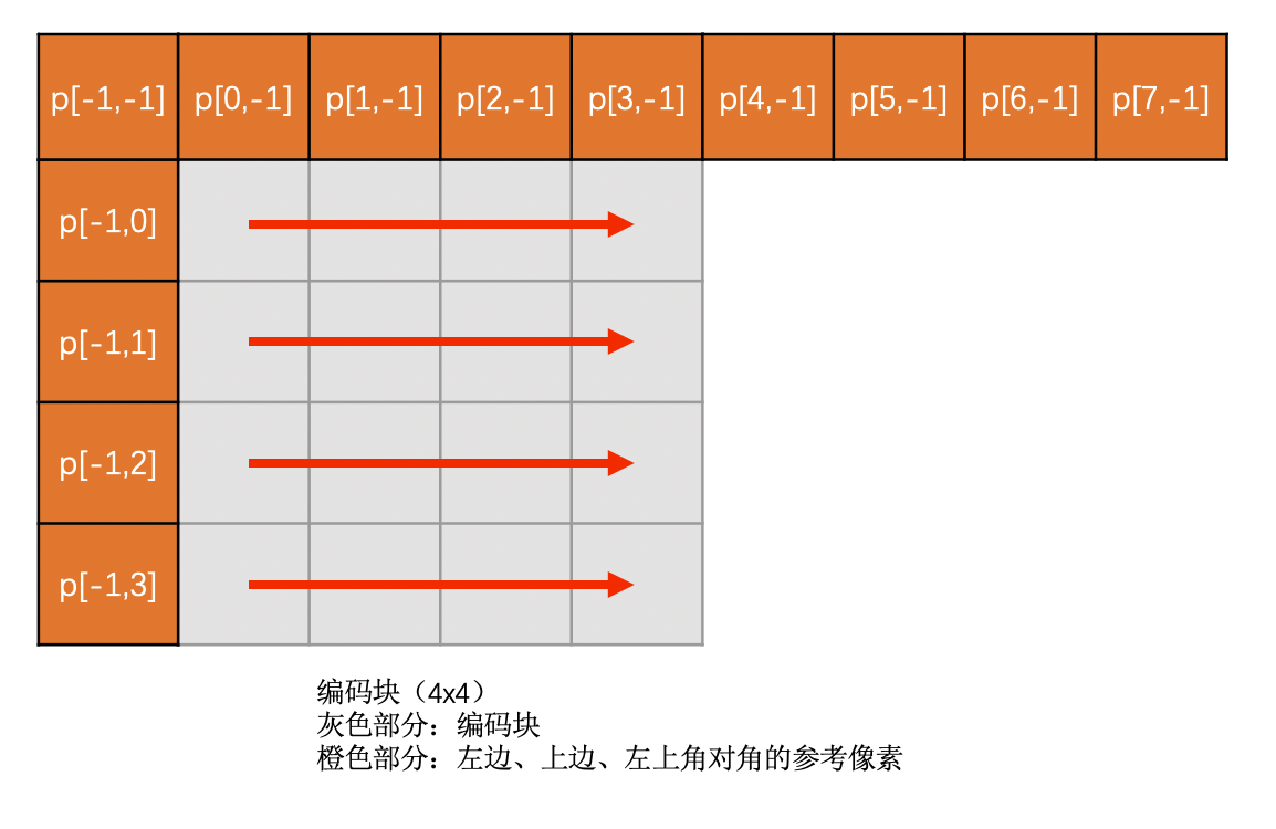 这里需要注意的一个点就是,我们是通过已经编码了的像素值去预测待编码的像素值。你可能会问,已经编码了的像素值变成码流了,不再是一个个像素了,怎么去预测待编码的像素呢?其实已经编码了的像素是会重建成重建像素,用来做之后待编码块的参考像素的。你可以认为是已经编码的块会解码成像素用来做参考像素。