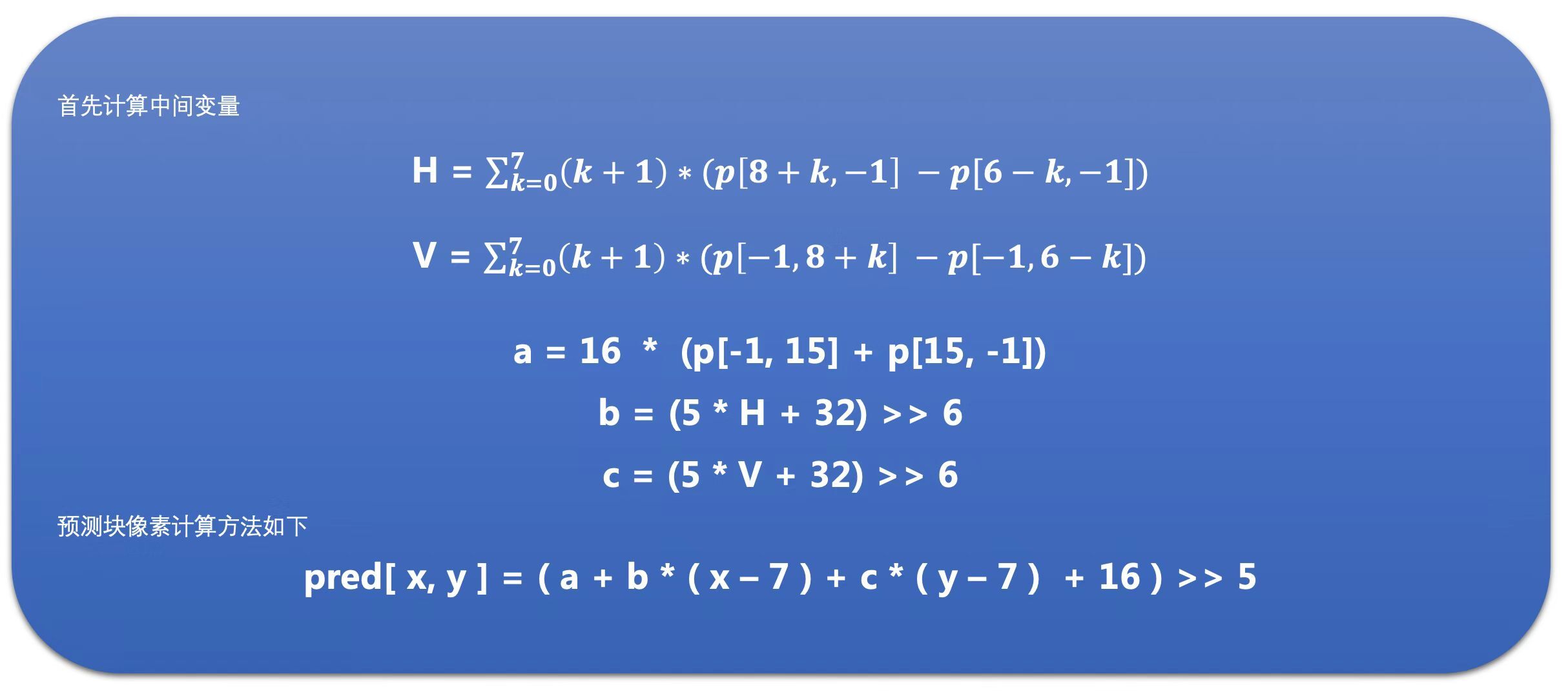 接下来我们介绍一下Plane模式。这种模式相比前面三种模式稍微复杂一些,但是基本原理都差不多。Plane预测块的每一个像素值,都是将上边已编码块的最下面那一行,和左边已编码块右边最后一列的像素值经过下面公式计算得到的。