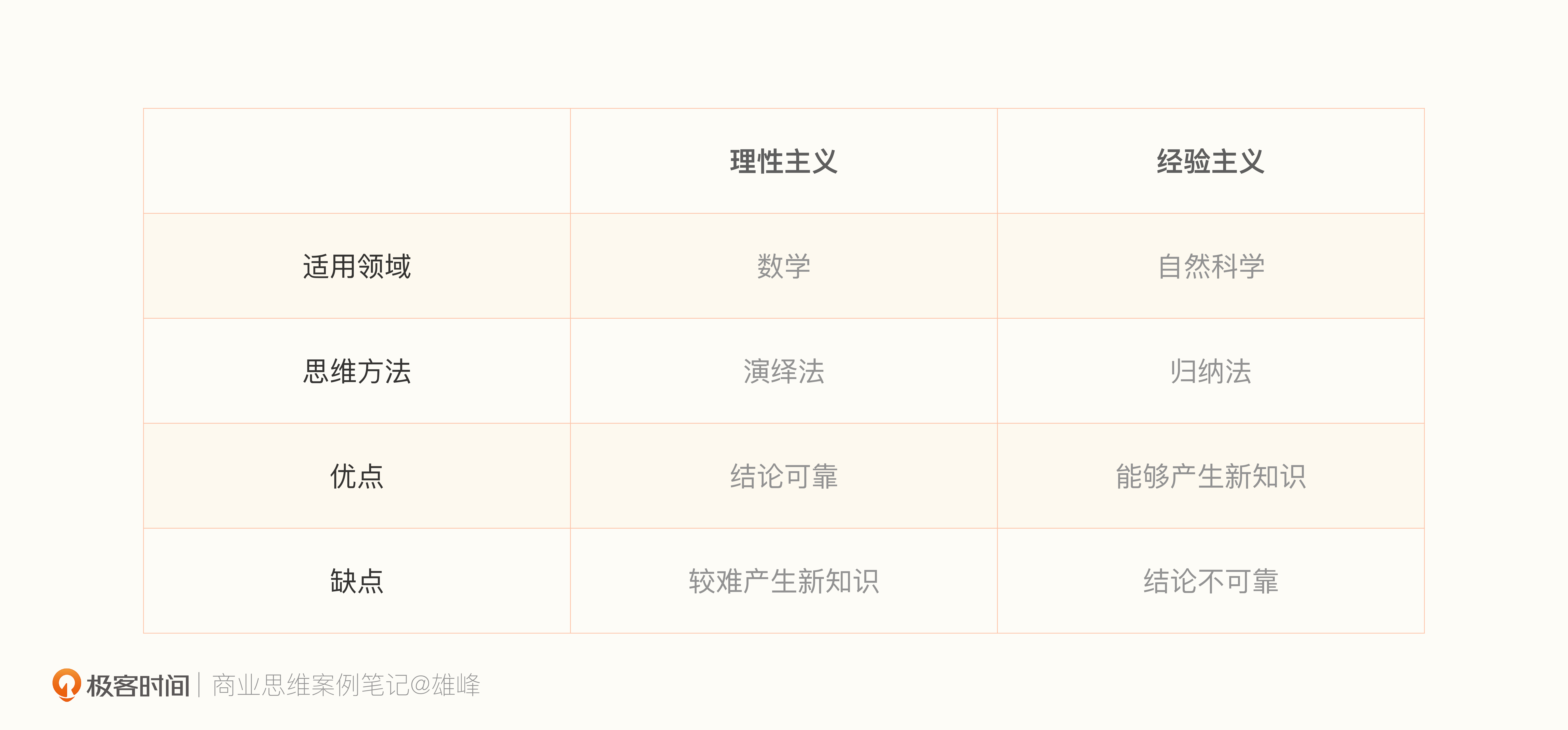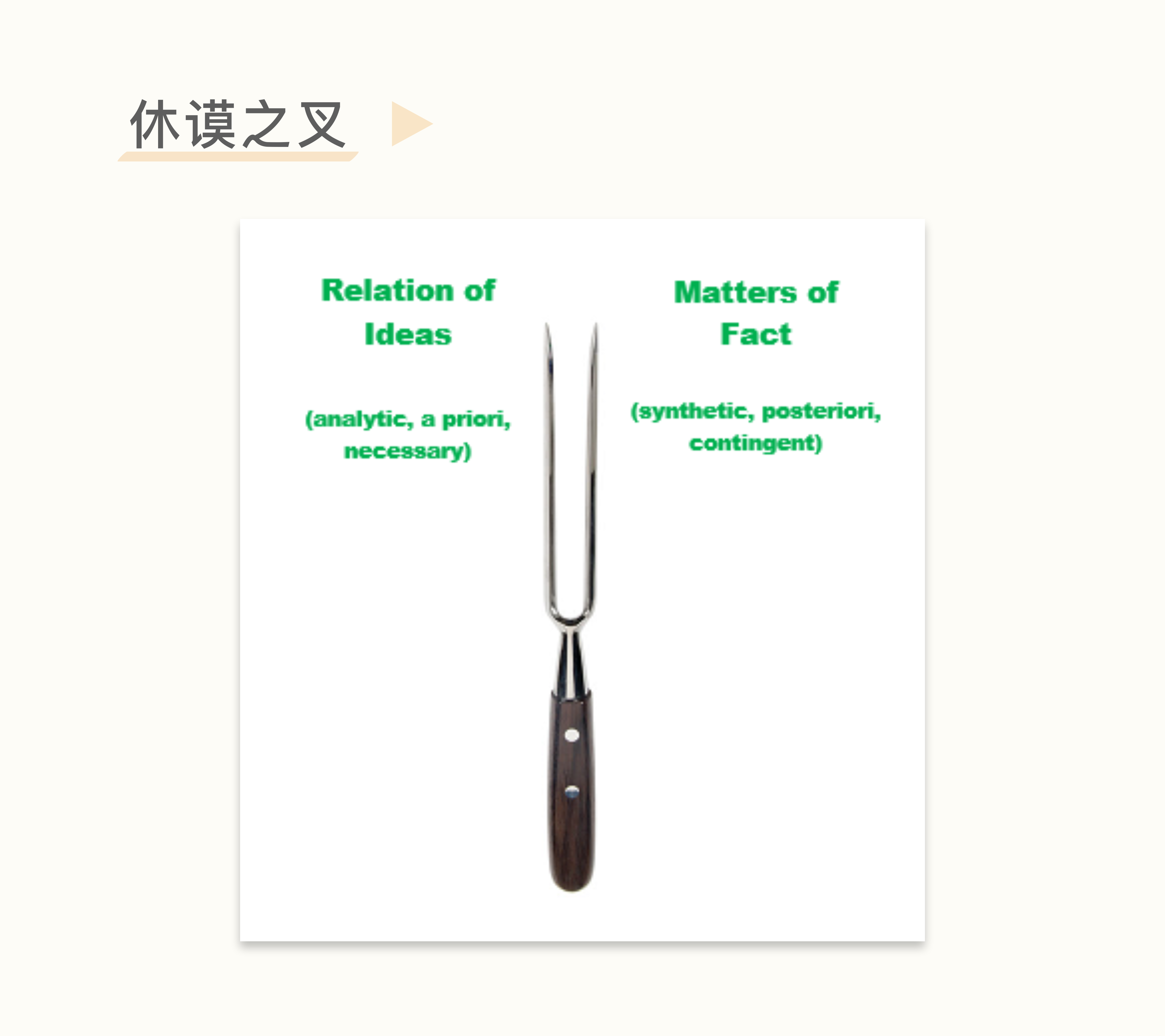 叉子的一边是理性知识,它们不需要经验的验证。比如数学,欧几里得的几何原理,通过几个简明易懂的公式从而构建数学殿堂的根基,数学的知识不需要做实验来验证,只需要理性思考就能够获得,而理性主义的思考方法就是演绎法,简单来说就是推导。