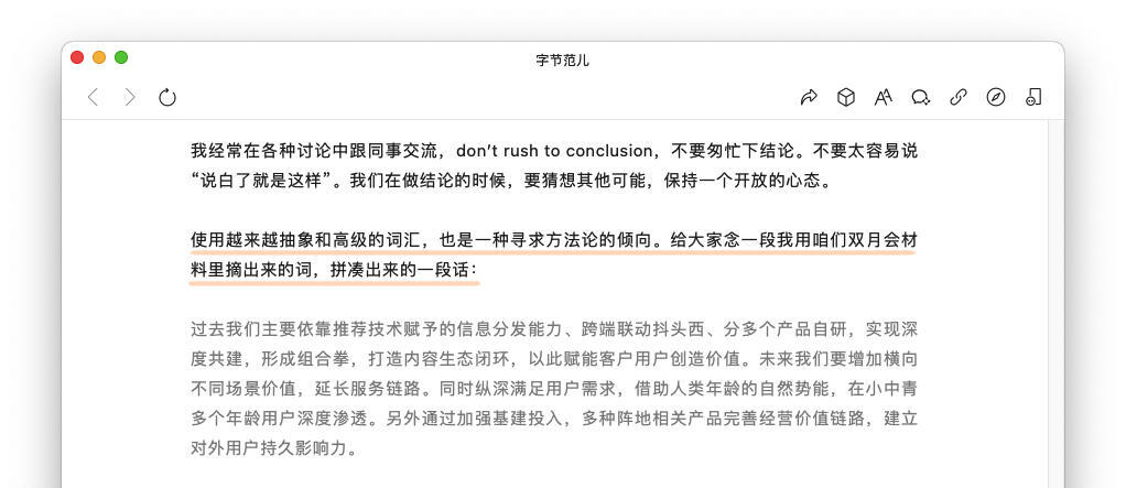 其中最大的引爆点就是张一鸣在举例说“什么是脱离平常心的表现”时说的:**对事物的过度抽象,对方法论的过度追求,也是一种走捷径不务实的表现,比如使用越来越抽象和高级的词汇。**演讲专门从公司的文档摘抄了一些词语,堪称互联网黑话+方法论结合的高级范本。
