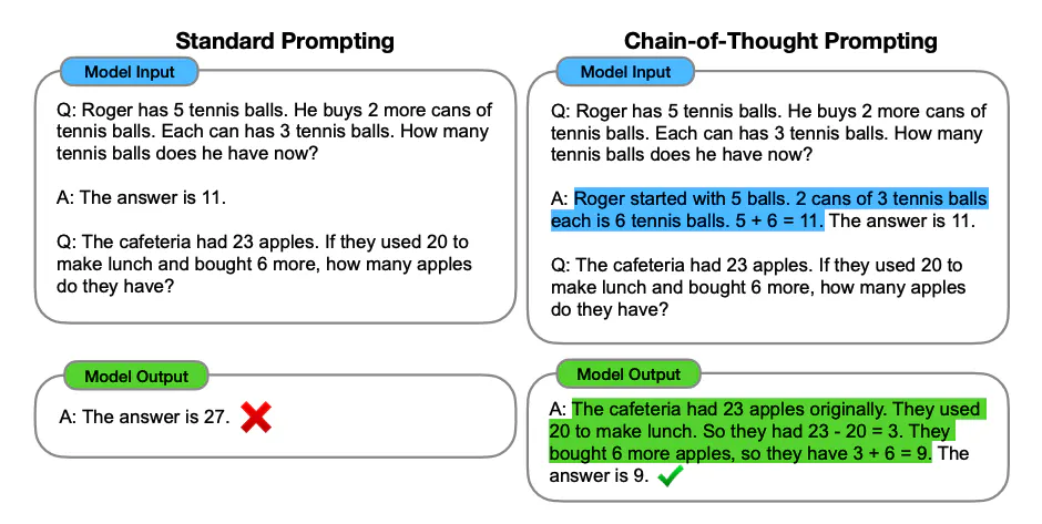 什么是思维链? 思维链,顾名思义,就是引导模型进行逐步推理的链条。通过分步骤思考,模型能够在复杂的任务中逐渐接近正确答案,避免因直接跳到结论而产生的错误。这种方法最初是由一句简单的提示语“Let’s think step by step”衍生出来的。这句提示语告诉模型:“我们一步一步来,别急。”这句话可以显著提高模型在处理复杂问题时的准确性。