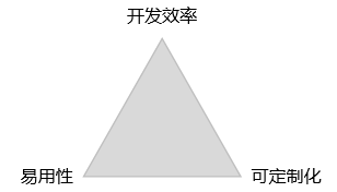 这个不可能三角表达的是开发效率、易用性、可定制化这三者最多只能拥有其二,而必须放弃第三个,三者不可兼得。