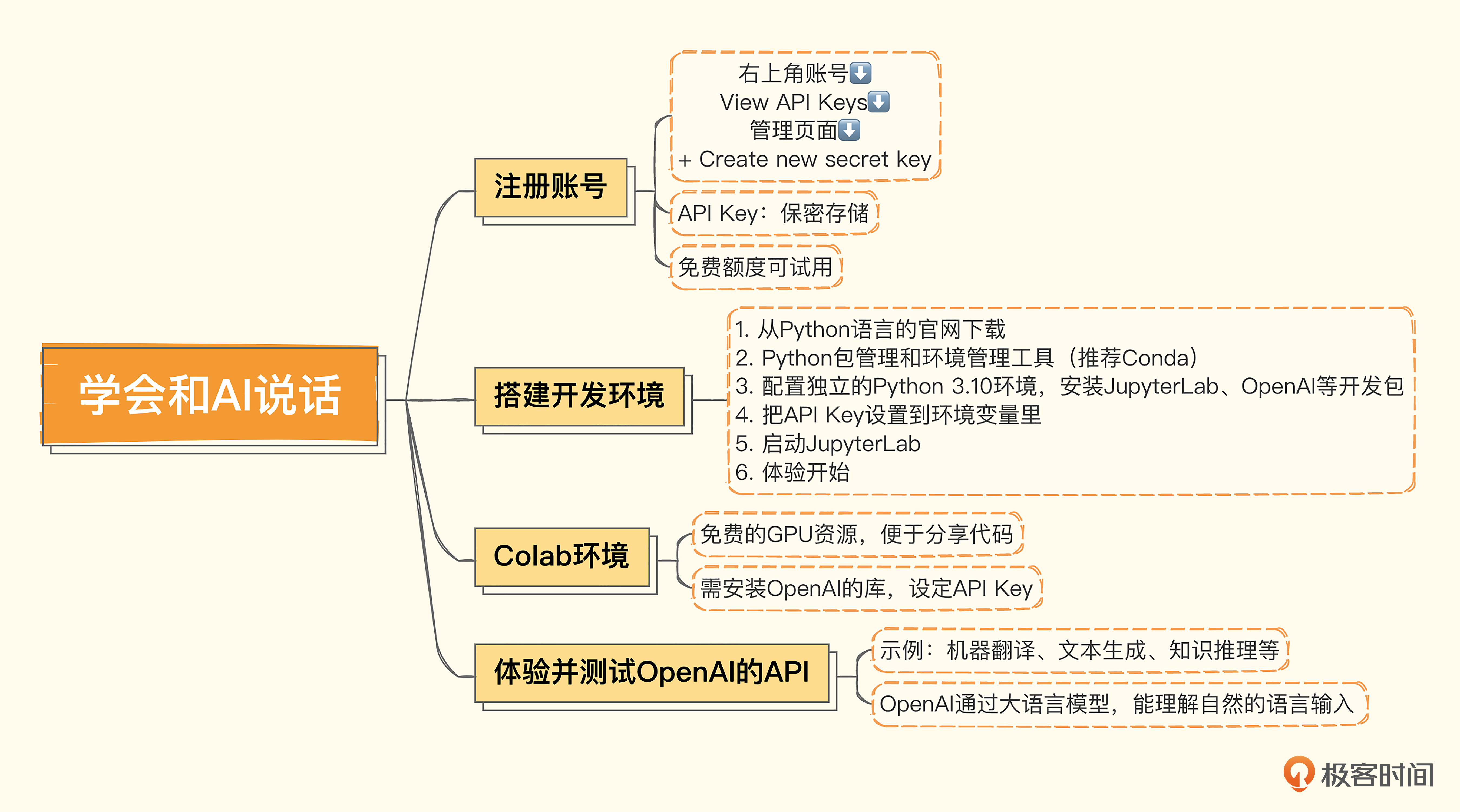 好了,希望到这里,你对OpenAI提供的大语言模型能干什么有了一个最直观的认识。同时,你也应该已经注册好了对应的账号,生成了调用大语言模型的API Key。无论是在本地搭建了开发环境,还是通过Colab这样免费在线的开发环境,你都应该已经尝试着调用过OpenAI的API拿到一些返回结果了。