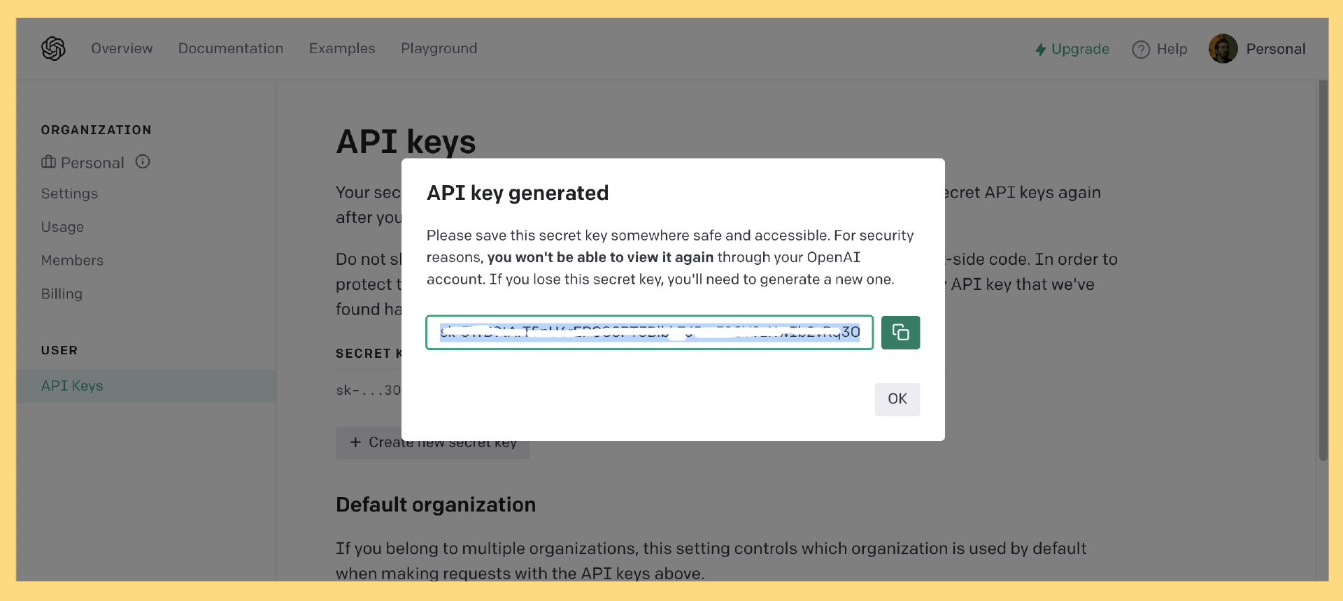 对应的API Key你需要把它存储在一个安全的地方,后面我们调用OpenAI的接口都需要使用这个API Key。