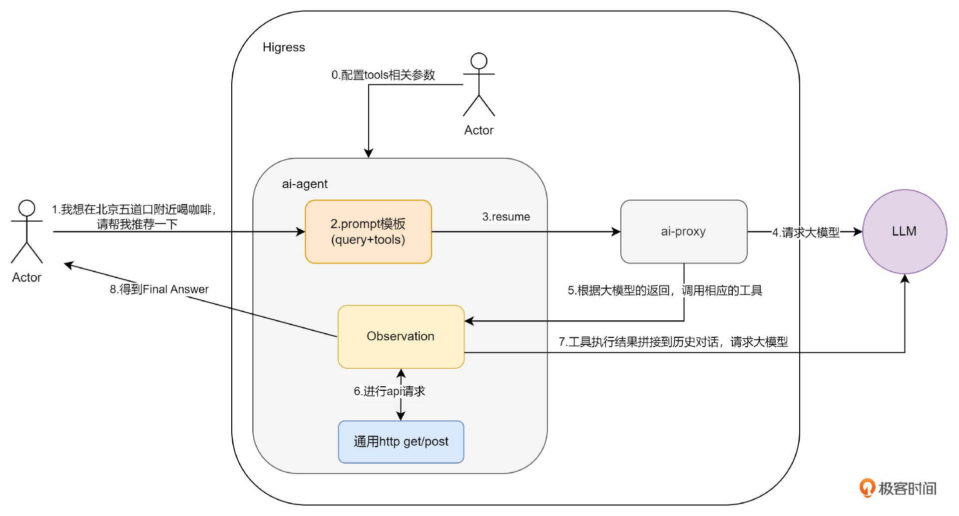 此时我们得到了大模型的第一次反馈,也就是是否要调用工具,还是已经得到了 Final Answer。此后就要循环思考了,如果要调用工具,就要使用同样的 HTTP 方法调用工具,并将结果反馈大模型,也就是图中的第 6、7 两步;如果得到了 Final Answer,就直接反馈给用户,也就是图中的第 8 步。