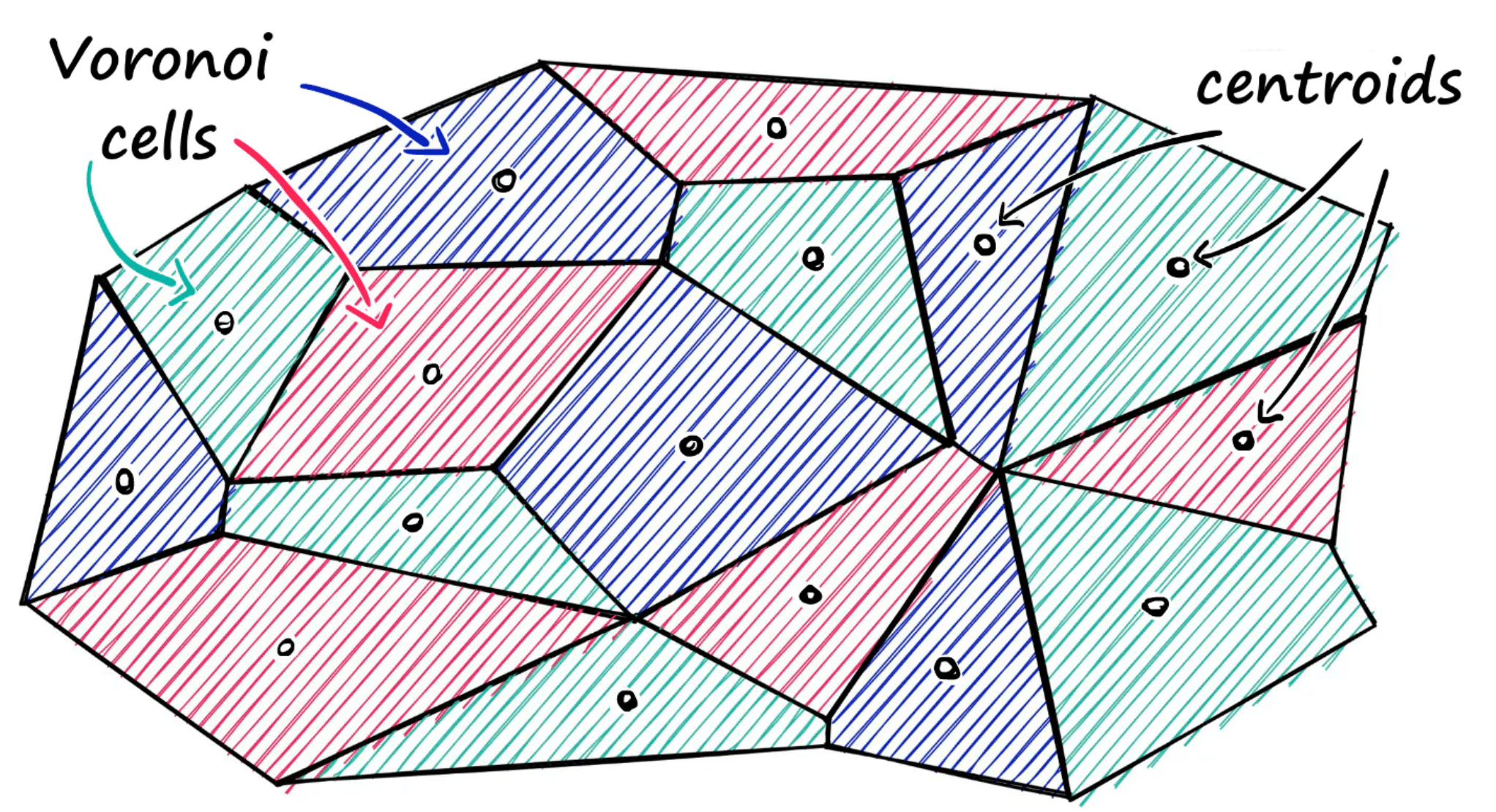 Faiss索引分片的逻辑,其实是先将图片向量化,聚簇归类,那么比较相近的向量会被归类到同一个Voronoi Cell,也就是分区,类似将一个平面划分为多个不规则的多边形,每个多边形有一个“形心”。检索的时候,我们先用检索向量,找到与他最近的“形心”,然后只需要在“形心”对应的多边形内检索,找到最近的向量即可。