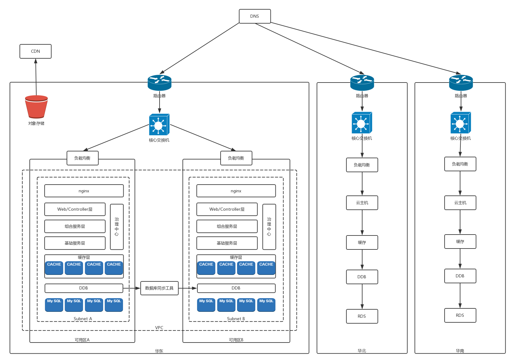 首先,咱们要有个电商平台。假设我们已经有了一个特别大的电商平台,这个平台应该部署在哪里呢?假设我们用公有云,一般公有云会有多个位置,比如在华东、华北、华南都有。毕竟咱们的电商是要服务全国的,当然到处都要部署了。我们把主站点放在华东。