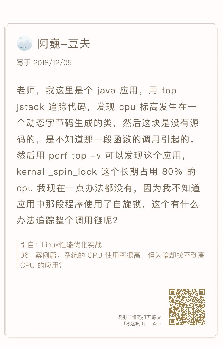我很高兴看到留言有这么高的学习热情,其实好多文章后面都有大量留言,希望我能推荐书籍和学习资料。这一点也是我乐意看到的。专栏学习一定不是你性能优化之旅的全部,能够带你入门、帮你解决实际问题、甚至是激发你的学习热情,已经让我非常开心。
