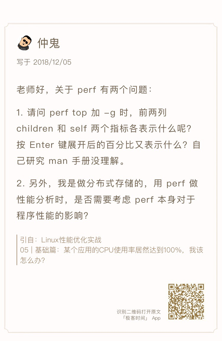 正如同学留言问到的,很多性能工具确实会对系统性能有一定影响。就拿 perf 来说,它需要在内核中跟踪内核栈的各种事件,那么不可避免就会带来一定的性能损失。这一点,虽然对大部分应用来说,没有太大影响,但对特定的某些应用(比如那些对时钟周期特别敏感的应用),可能就是灾难了。