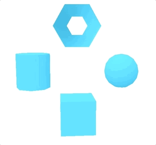 有了WebGL程序之后,我们使用它和几何体对象来构建真正的网格(Mesh)元素,最终再把这些元素渲染到画布上。我们创建了4个网格对象,它们的形状分别是环面、球体、立方体和圆柱,我们给它们设置了不同的位置,然后将它们添加到场景scene中去。
