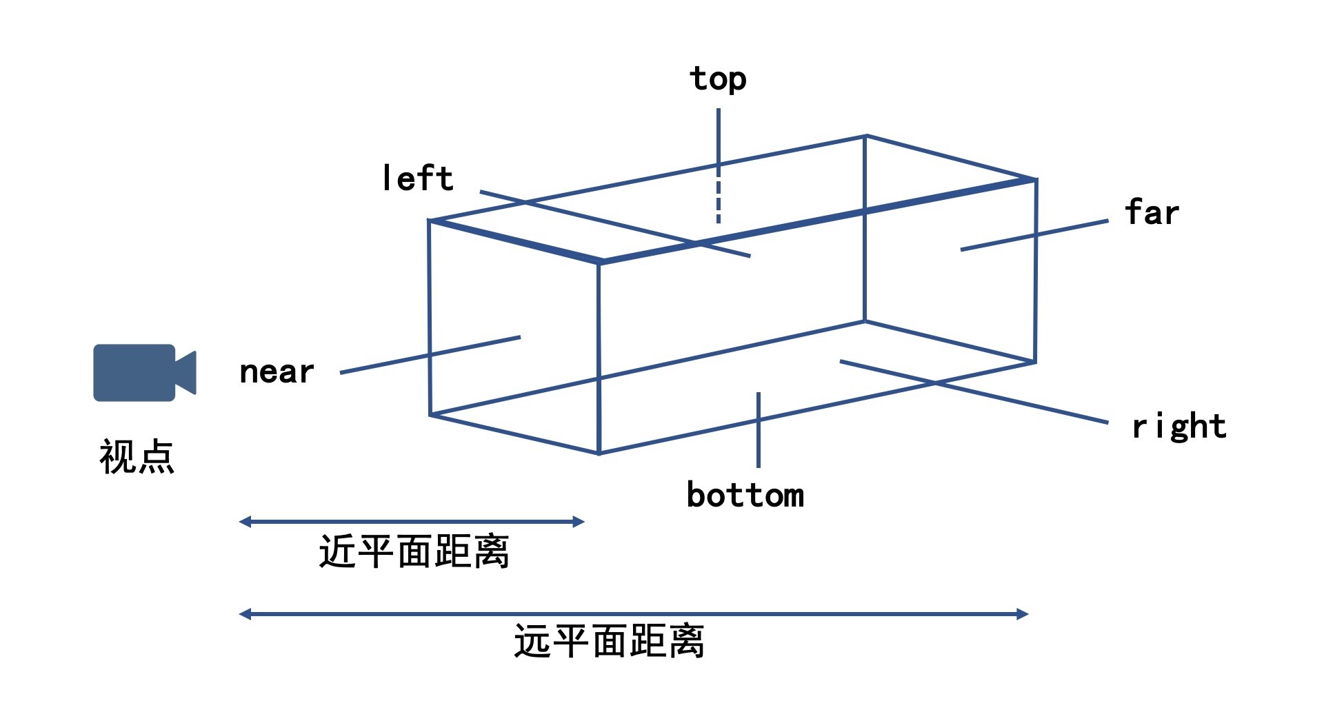 其中,ortho是计算正投影的函数,它的参数是视景体x、y、z三个方向的坐标范围,它的返回值就是投影矩阵。而perspective是计算透视投影的函数,它的参数是近景平面near、远景平面far、视角fov和宽高比率aspect,返回值也是投影矩阵。