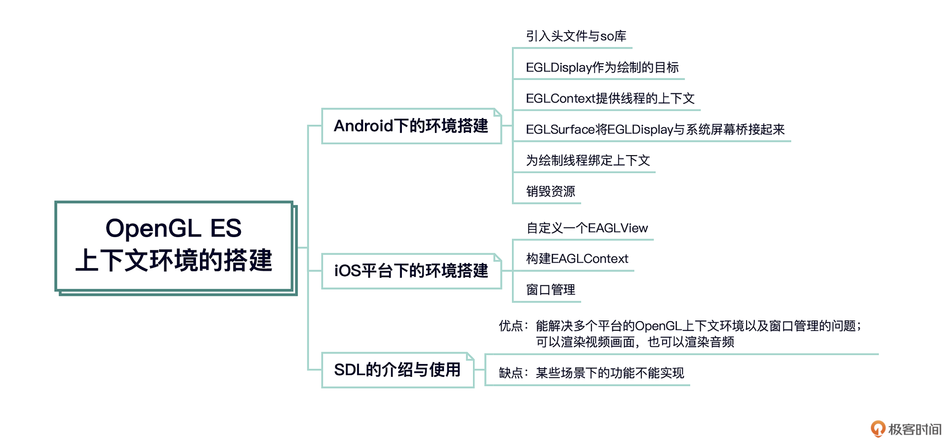 这节课我们分别为Android和iOS平台构建出了OpenGL ES的上下文环境,也给你讲解了使用SDL的方法以及优势。