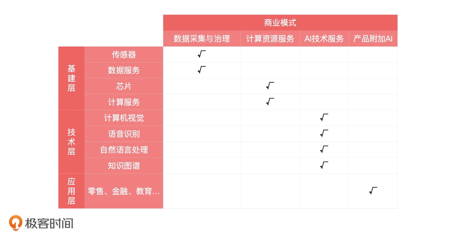 在人工智能产业中,处于不同层级的企业,根据自身能力和方向的不同,都有自己的一套商业模式,充分了解 AI 公司的商业模式,可以成为我们转型 AI 产品经理的重要参考信息,也是我们进一步整理出AI产品经理的人才结构图的依据。