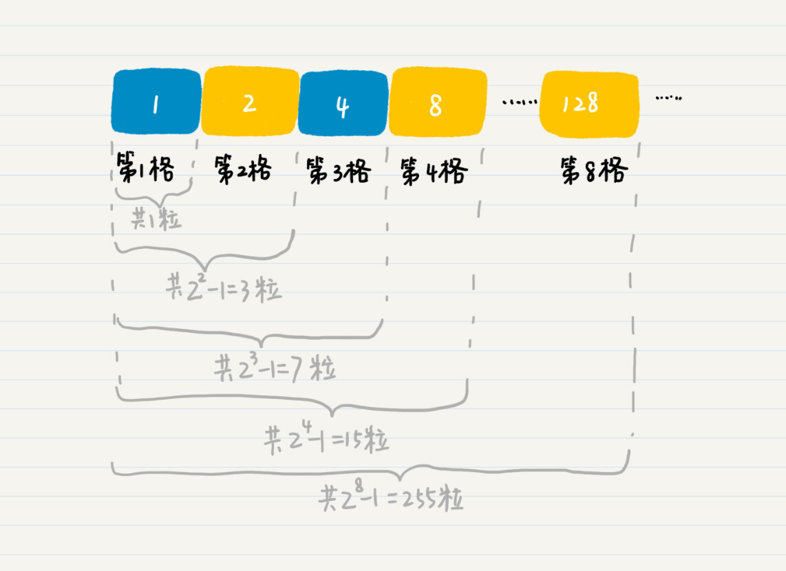 上节我们提到,在棋盘上放麦粒的规则是,第一格放一粒,第二格放两粒,以此类推,每一小格内都比前一小格多一倍的麦子,直至放满$64$个格子。