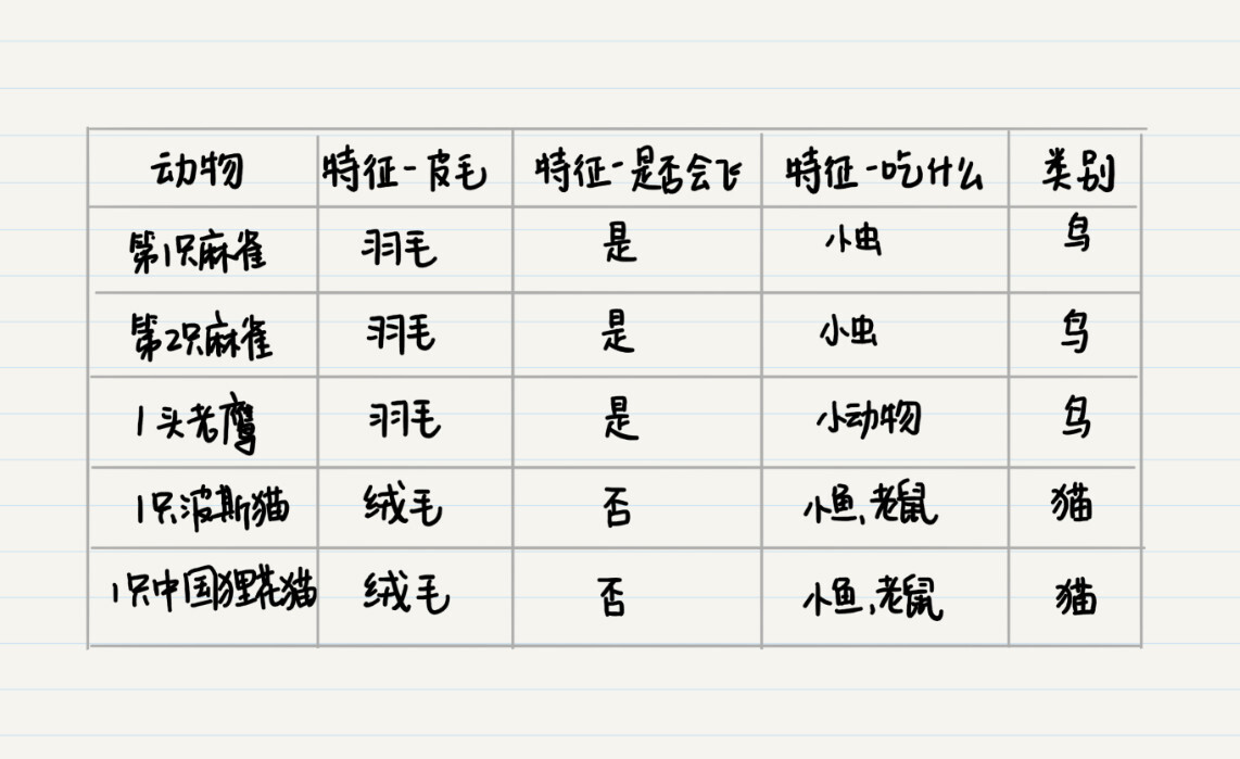 通过观察$5$个动物样本的$3$个特征,从而得到某种动物应该具有何种特征,这种方法就是我们平时所提到的归纳法。