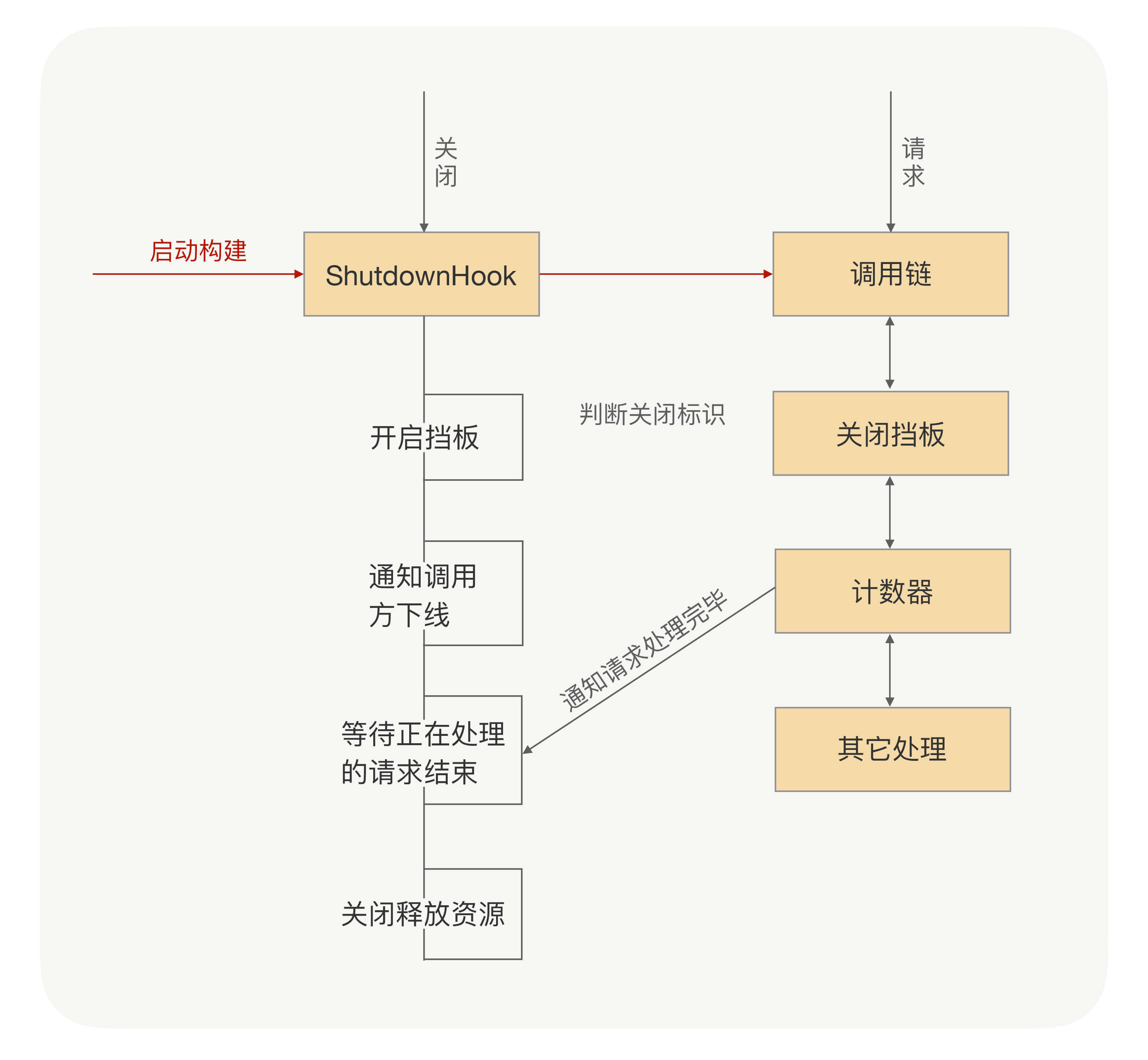 在我的经验里,可以通过捕获操作系统的进程信号来获取,在Java语言里面,对应的是Runtime.addShutdownHook方法,可以注册关闭的钩子。在RPC启动的时候,我们提前注册关闭钩子,并在里面添加了两个处理程序,一个负责开启关闭标识,一个负责安全关闭服务对象,服务对象在关闭的时候会通知调用方下线节点。同时需要在我们调用链里面加上挡板处理器,当新的请求来的时候,会判断关闭标识,如果正在关闭,则抛出特定异常。