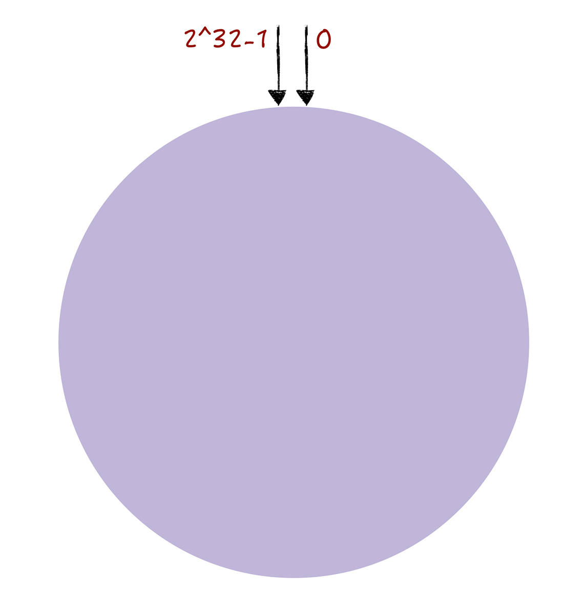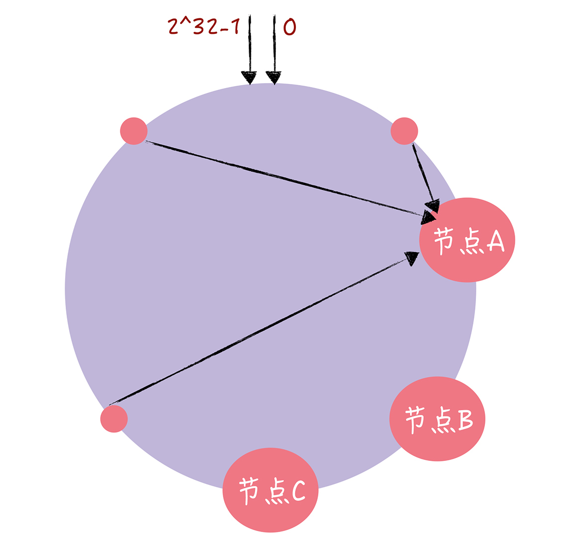 从图4中你可以看到,哈希环的空间是按顺时针方向组织的,圆环的正上方的点代表0,0点右侧的第一个点代表1,以此类推,2、3、4、5、6……直到2^32-1,也就是说0点左侧的第一个点代表2^32-1。