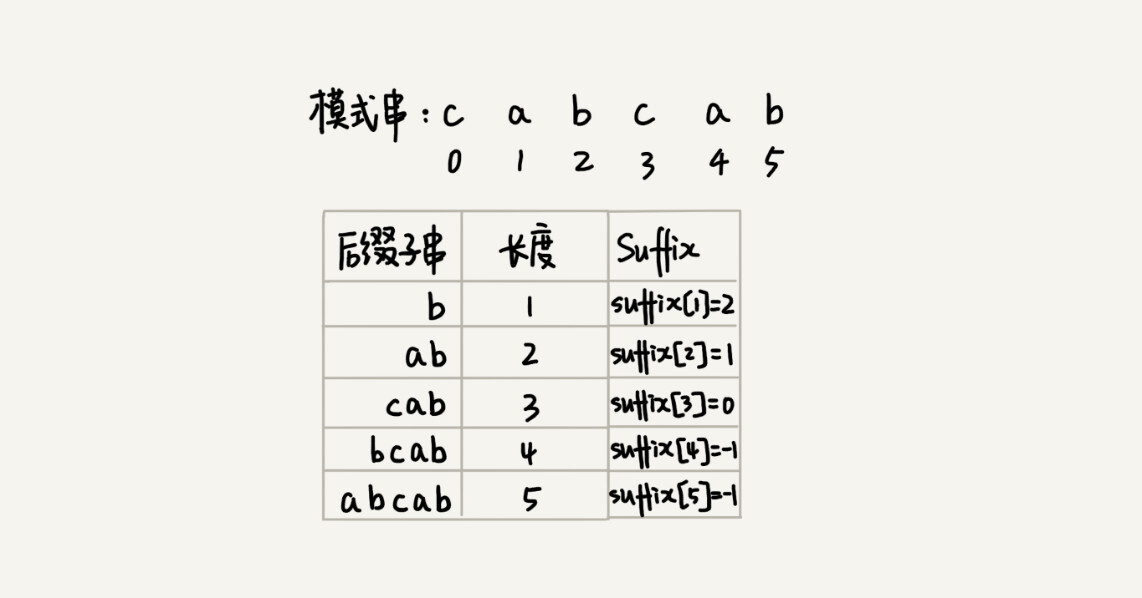 我们先来看,**如何表示模式串中不同的后缀子串呢?**因为后缀子串的最后一个字符的位置是固定的,下标为m-1,我们只需要记录长度就可以了。通过长度,我们可以确定一个唯一的后缀子串。