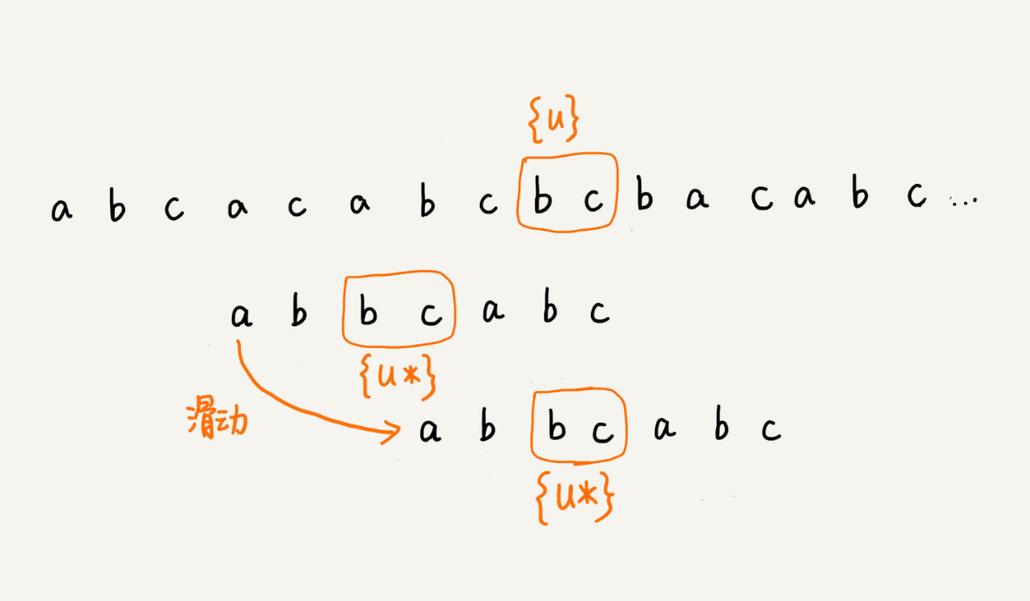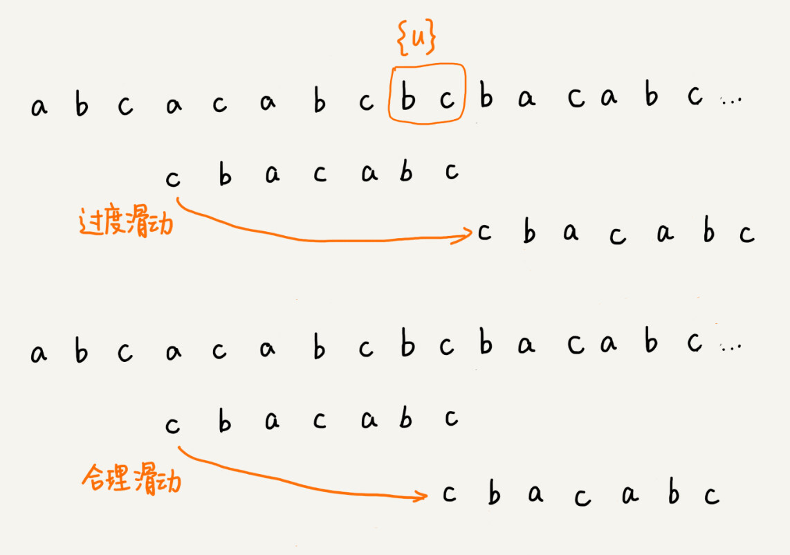 如果在模式串中找不到另一个等于{u}的子串,我们就直接将模式串,滑动到主串中{u}的后面,因为之前的任何一次往后滑动,都没有匹配主串中{u}的情况。