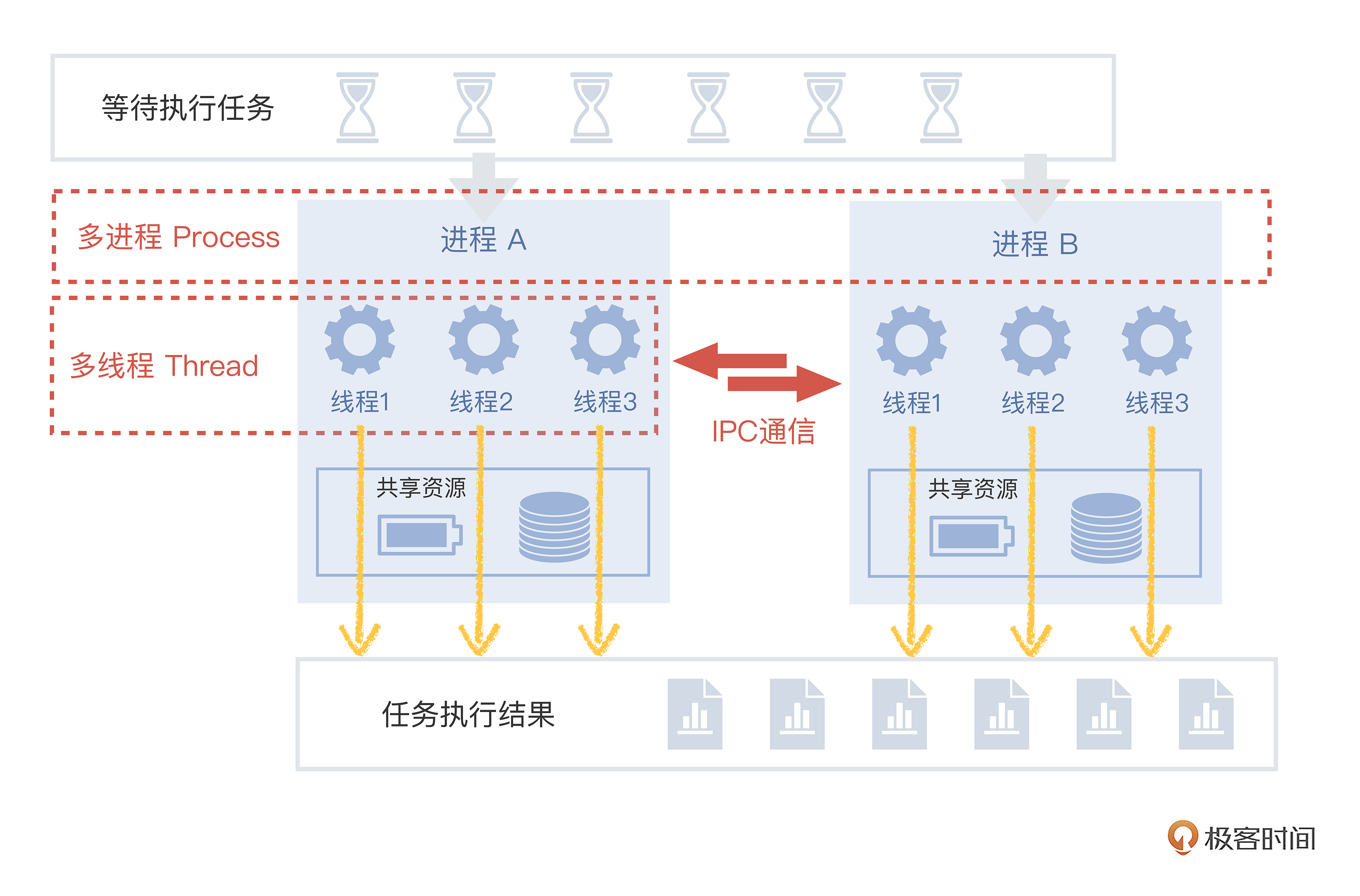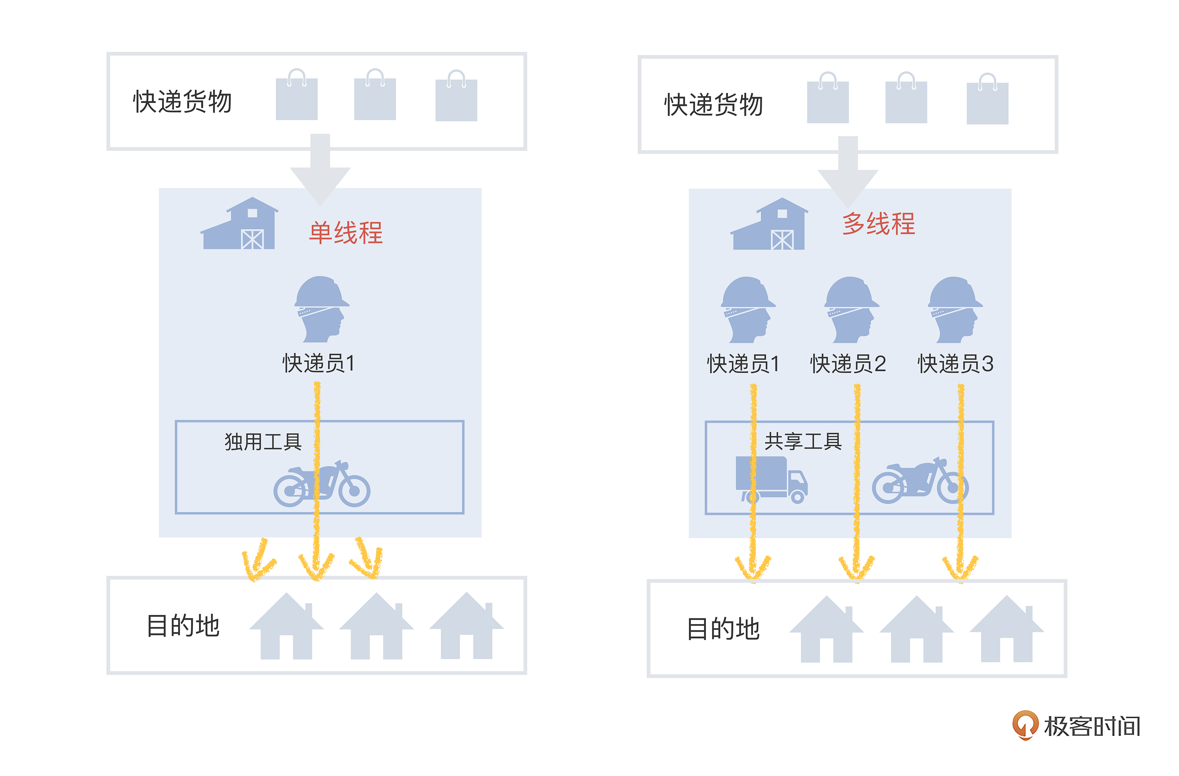 听起来有点抽象,我们还是用“发快递”的例子来类比“多进程”和“多线程”。