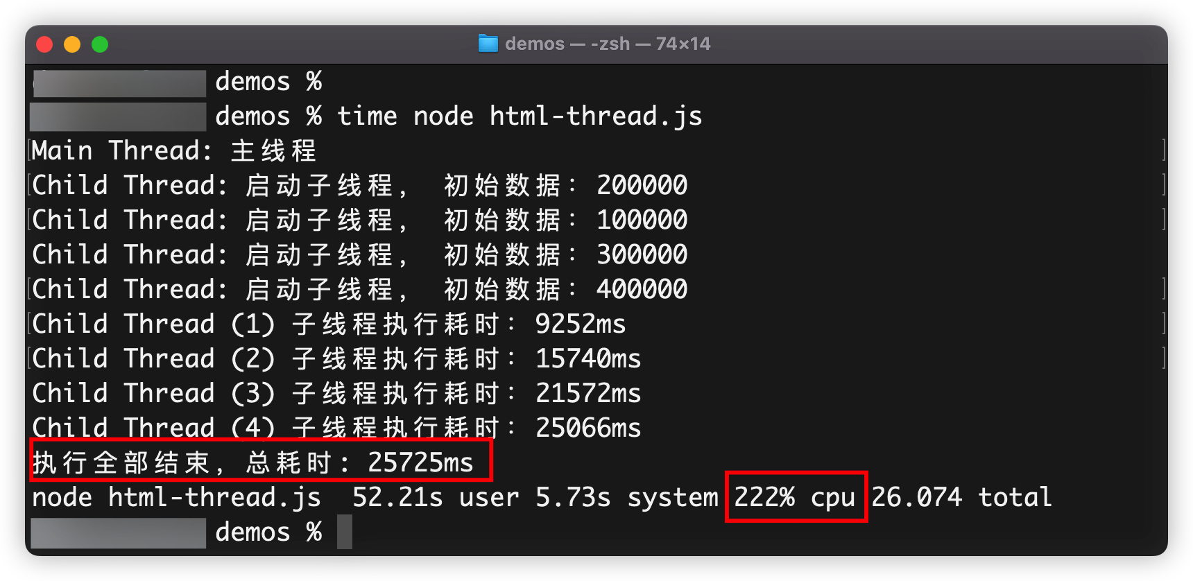 用多线程模式(单进程的多线程),耗时25秒左右,CPU使用率达到222%,比刚才的单线程96%使用率高,这是因为利用多线程,发挥了多核CPU的算力,得到性能的提升,提高运行速度,降低运行时间。