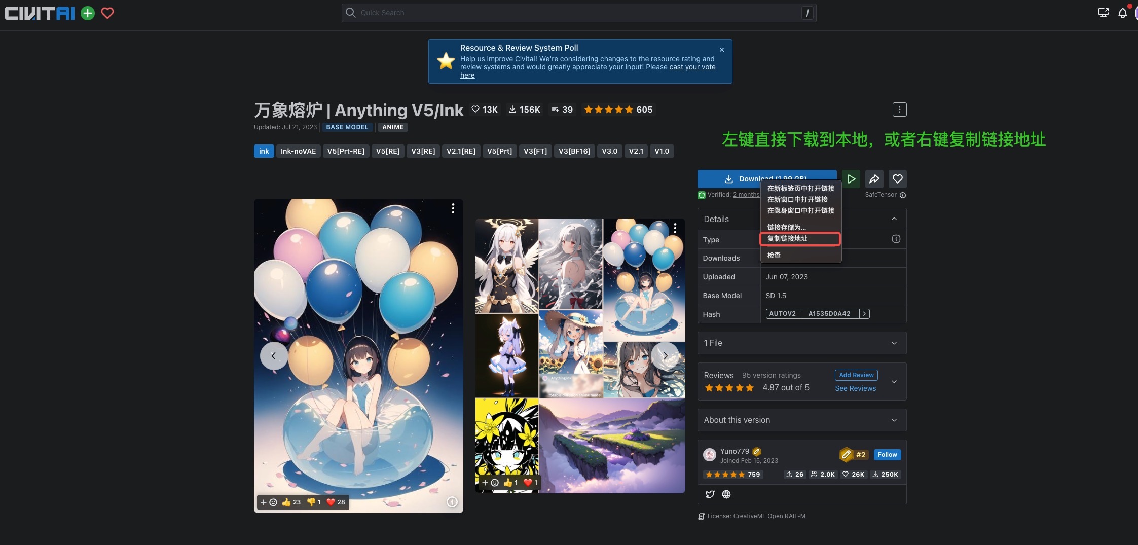 这一讲我们的目标是宝可梦和彩铅风格这两个任务,我们可以选择 Anything V5模型作为基础模型。你可以在 Civitai 中找到这个模型的权重,按照下面图中展示的方法把模型下载到本地,或者右键复制链接地址。